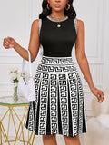 Sale Geo Print Splicing Tank Dress, Elegant Crew Neck Sleeveless Dress