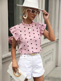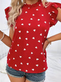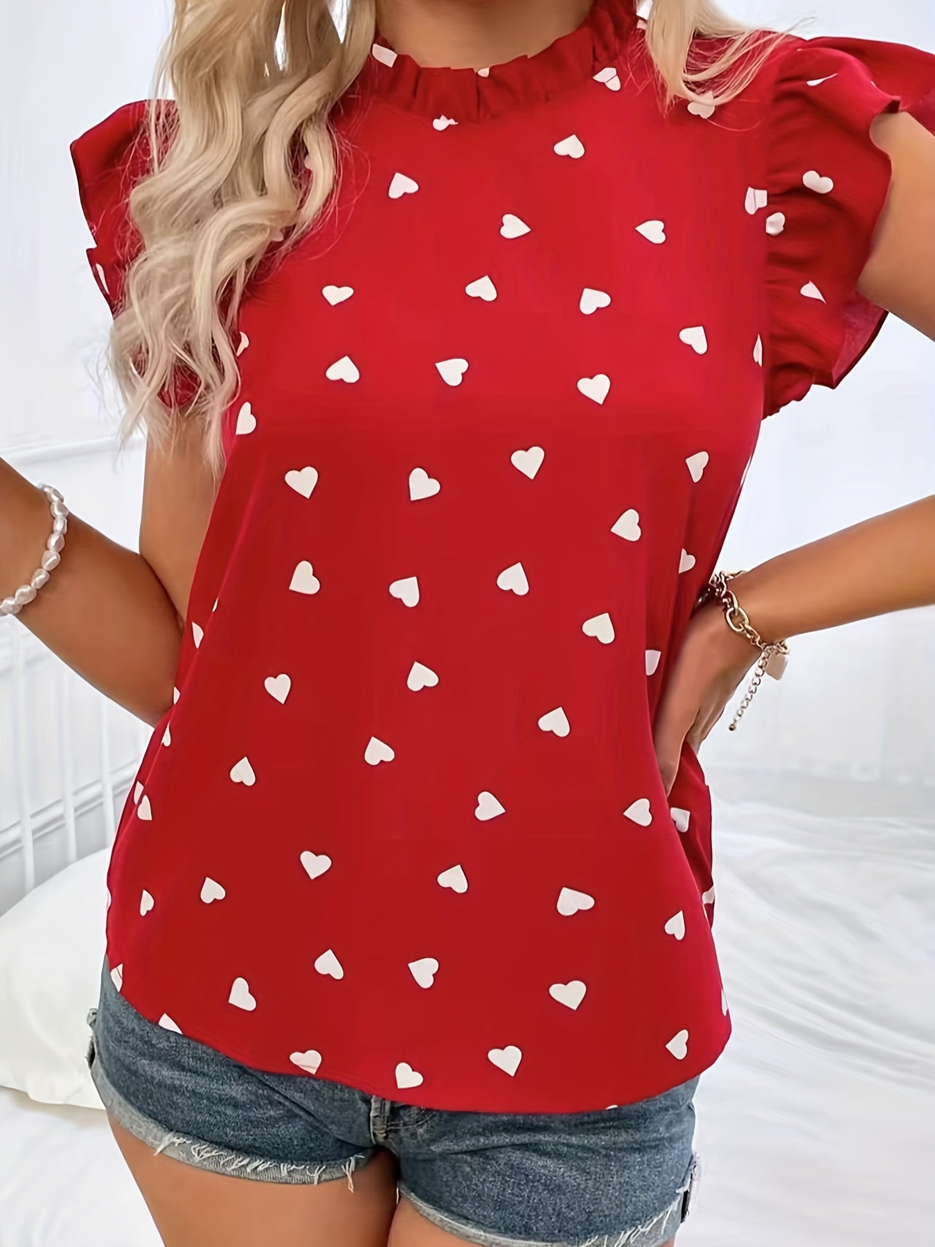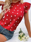 Heart Print Ruffle Trim Blouse, Casual Pleated Crew Neck Blouse