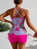 Leaf Print 2 Piece Set Tankini, Criss Cross Straps Tie Side Boxer Short Bottom Swimsuits