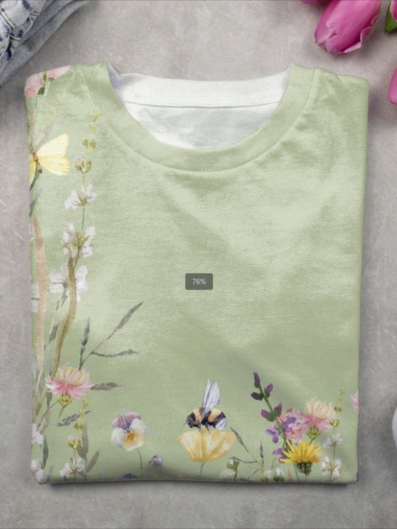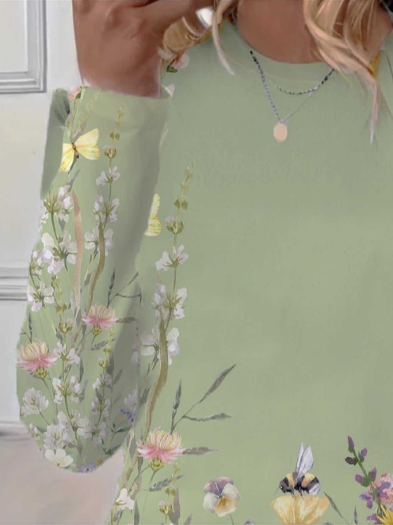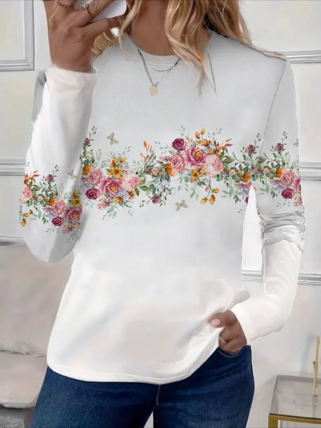Long Sleeve Floral Printing Crew Neck Casual Graphic Tee