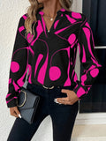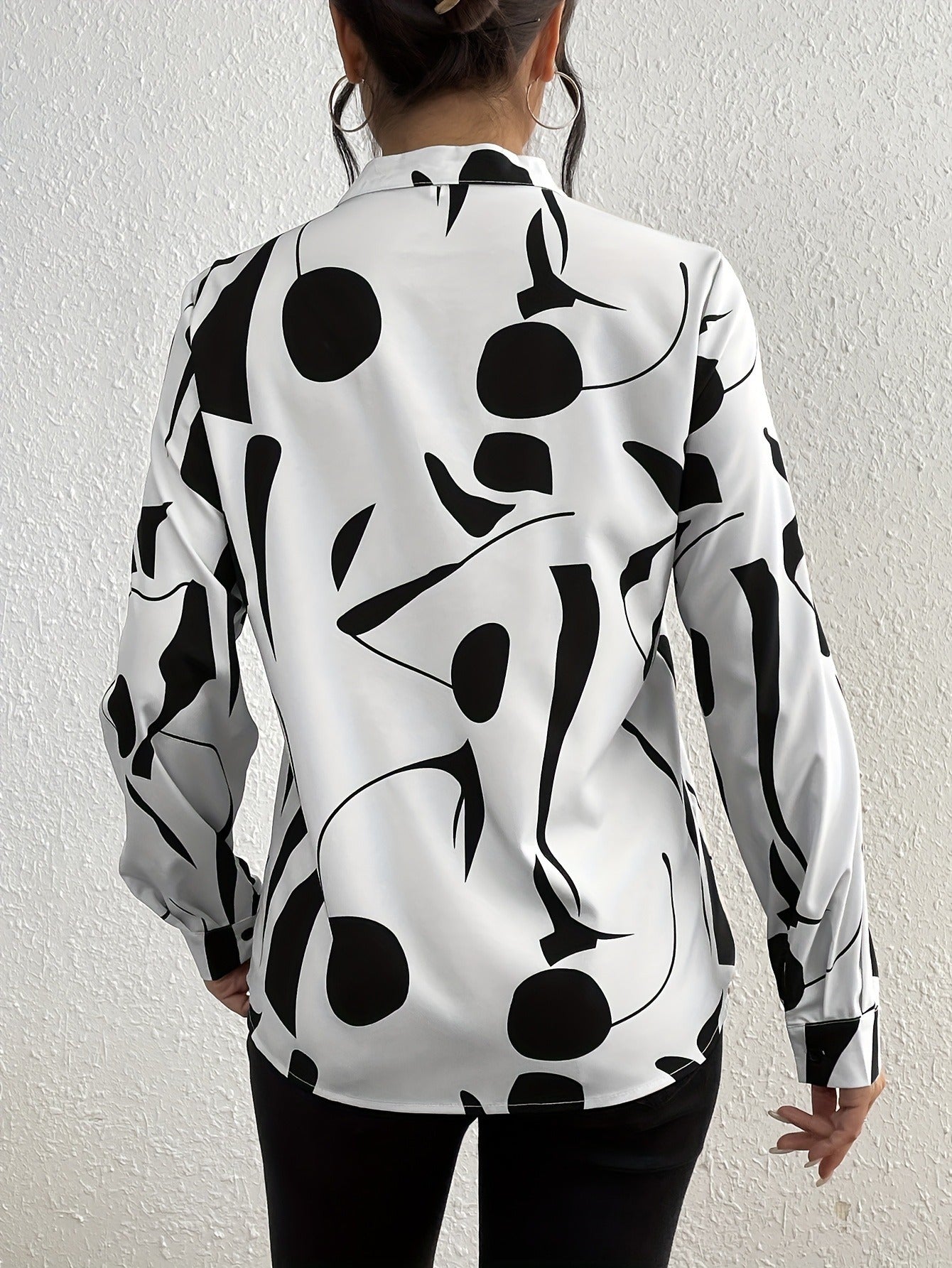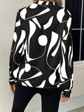 Long Sleeve Geometric Print Blouse - Elegant Notched Neck, Relaxed Fit