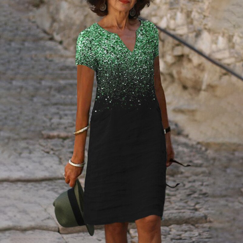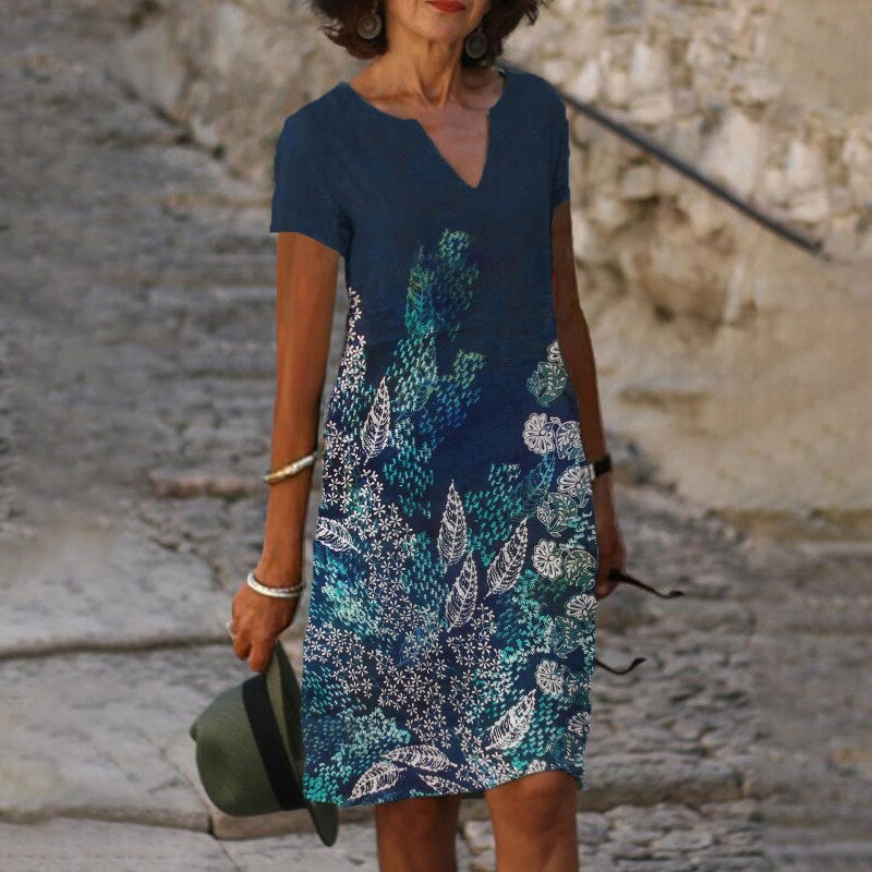 Sale Loose Print Elegant V-neck Short Sleeve Knee-length Midi Dress