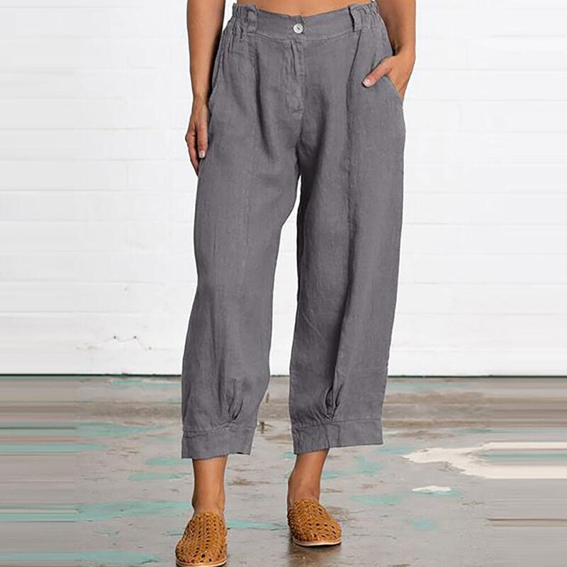 Sale Loose Solid Pocket Cotton and Linen Cropped Pants