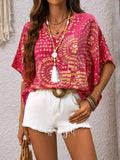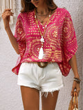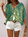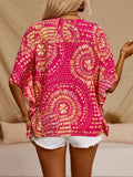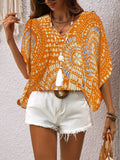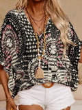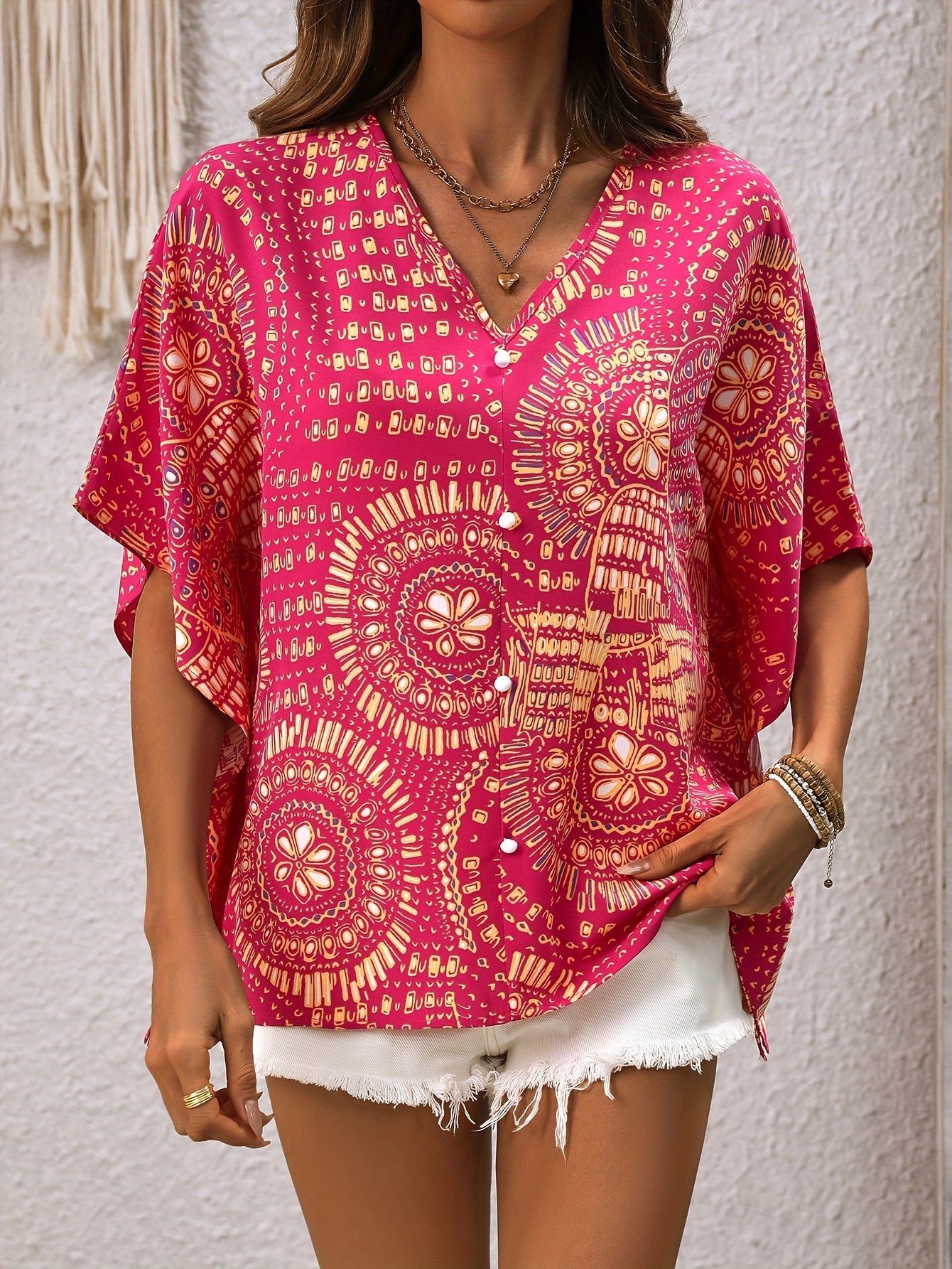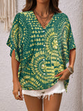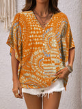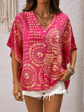 Mandala Print V-neck Blouse, Vacation Style Batwing Sleeve Top
