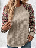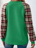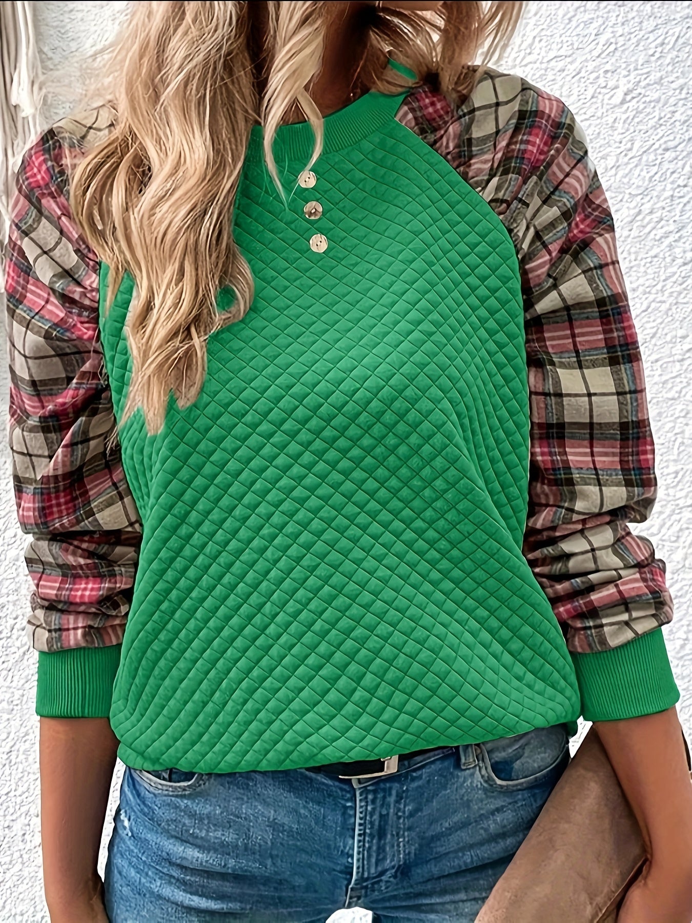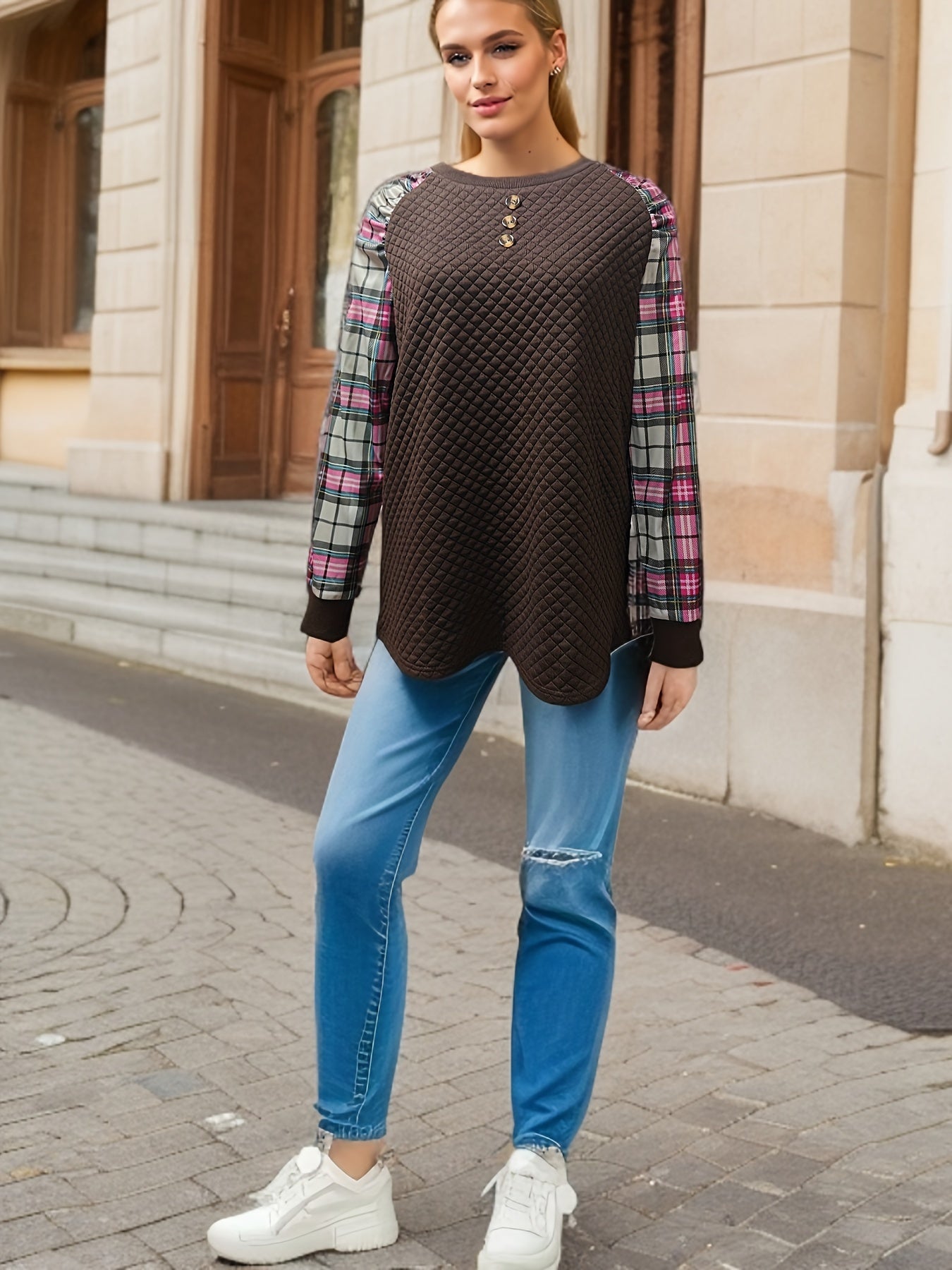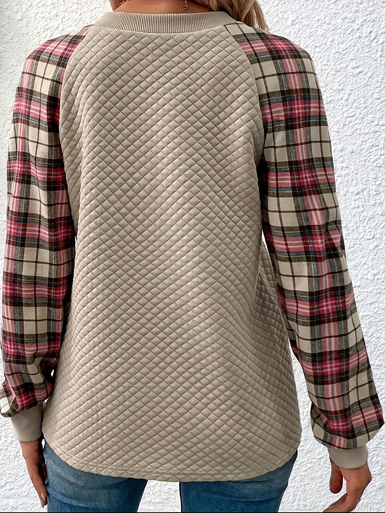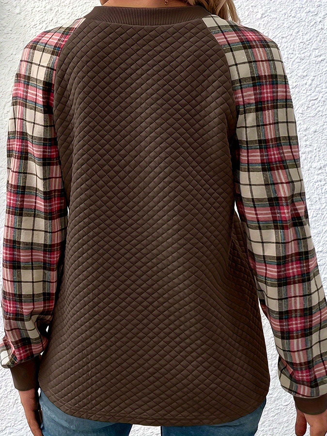 Plaid Print Button Front Crew Neck T-Shirt, Casual Long Sleeve Top