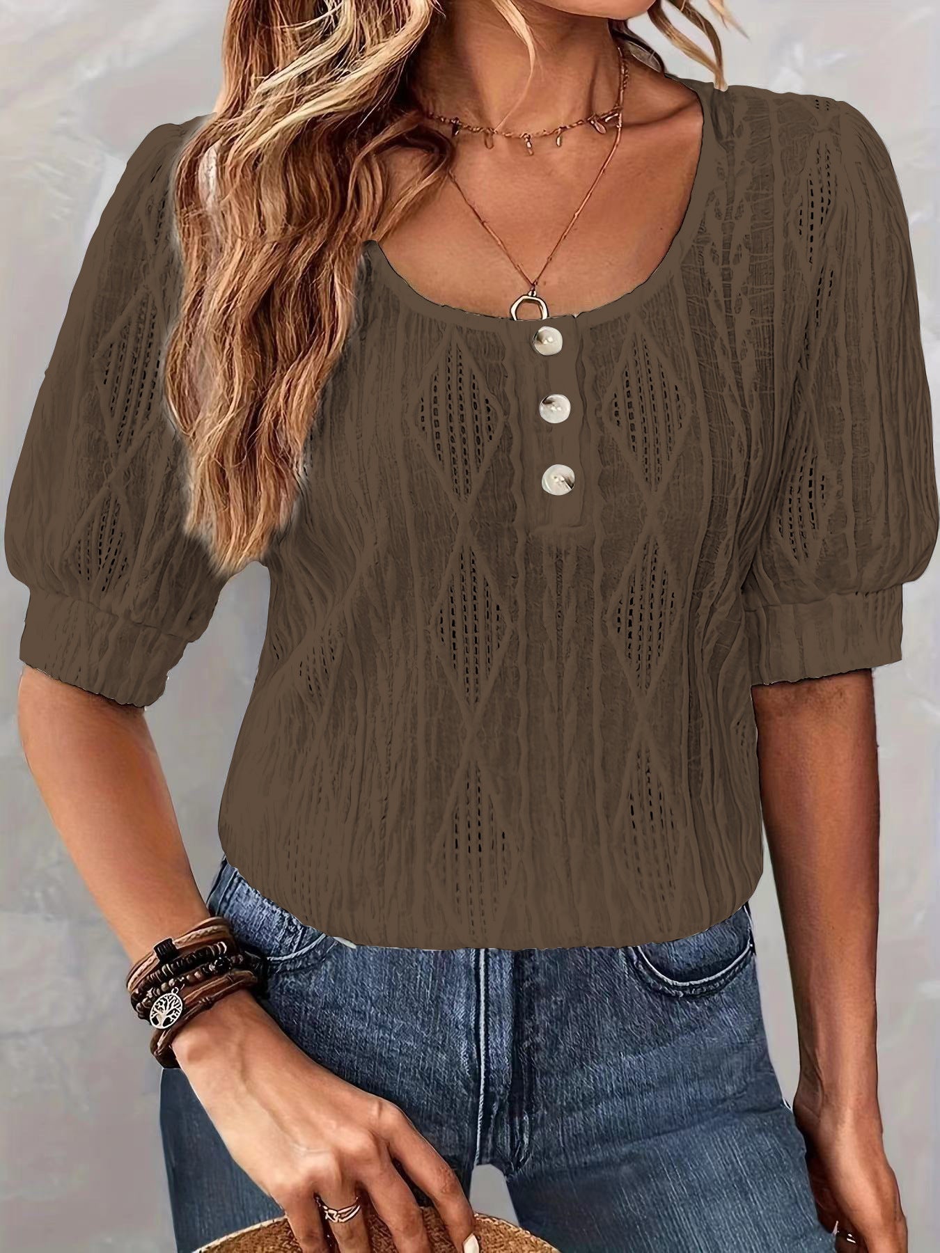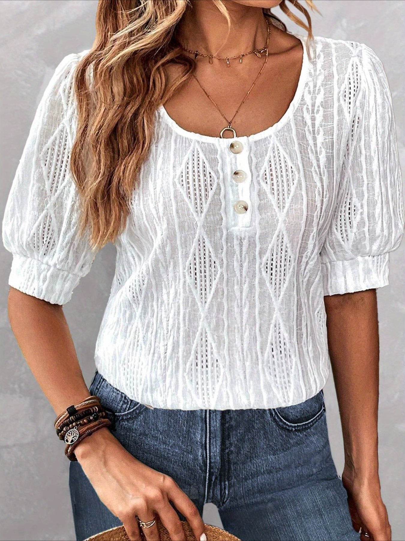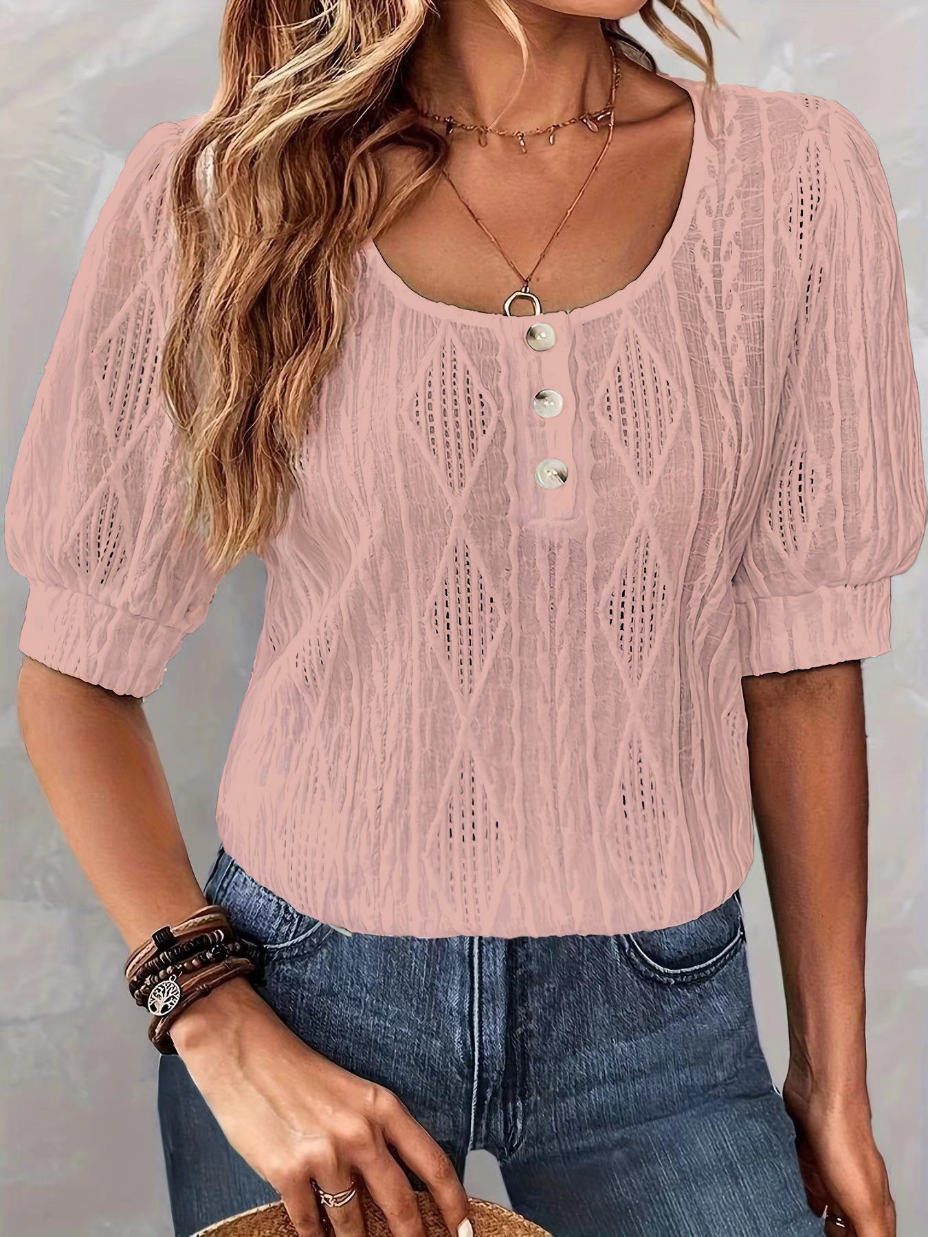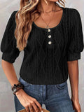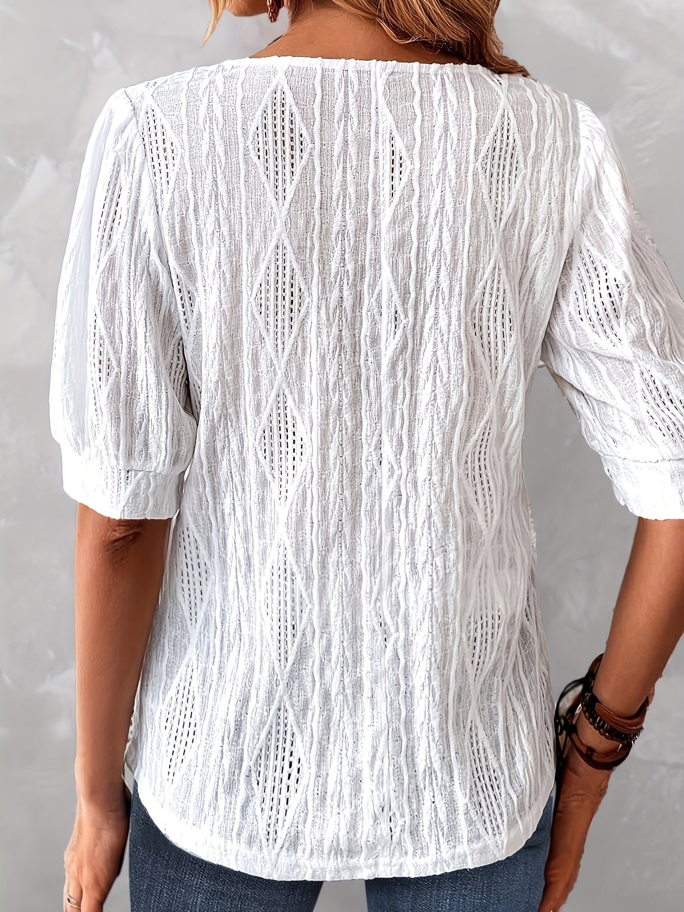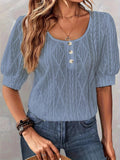Sale Solid Pleated Trim Blouse, Casual Crew Neck Short Sleeve Blouse