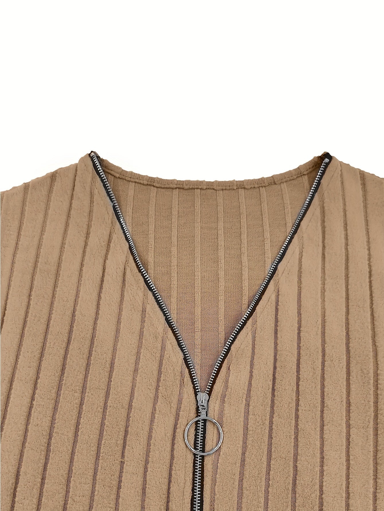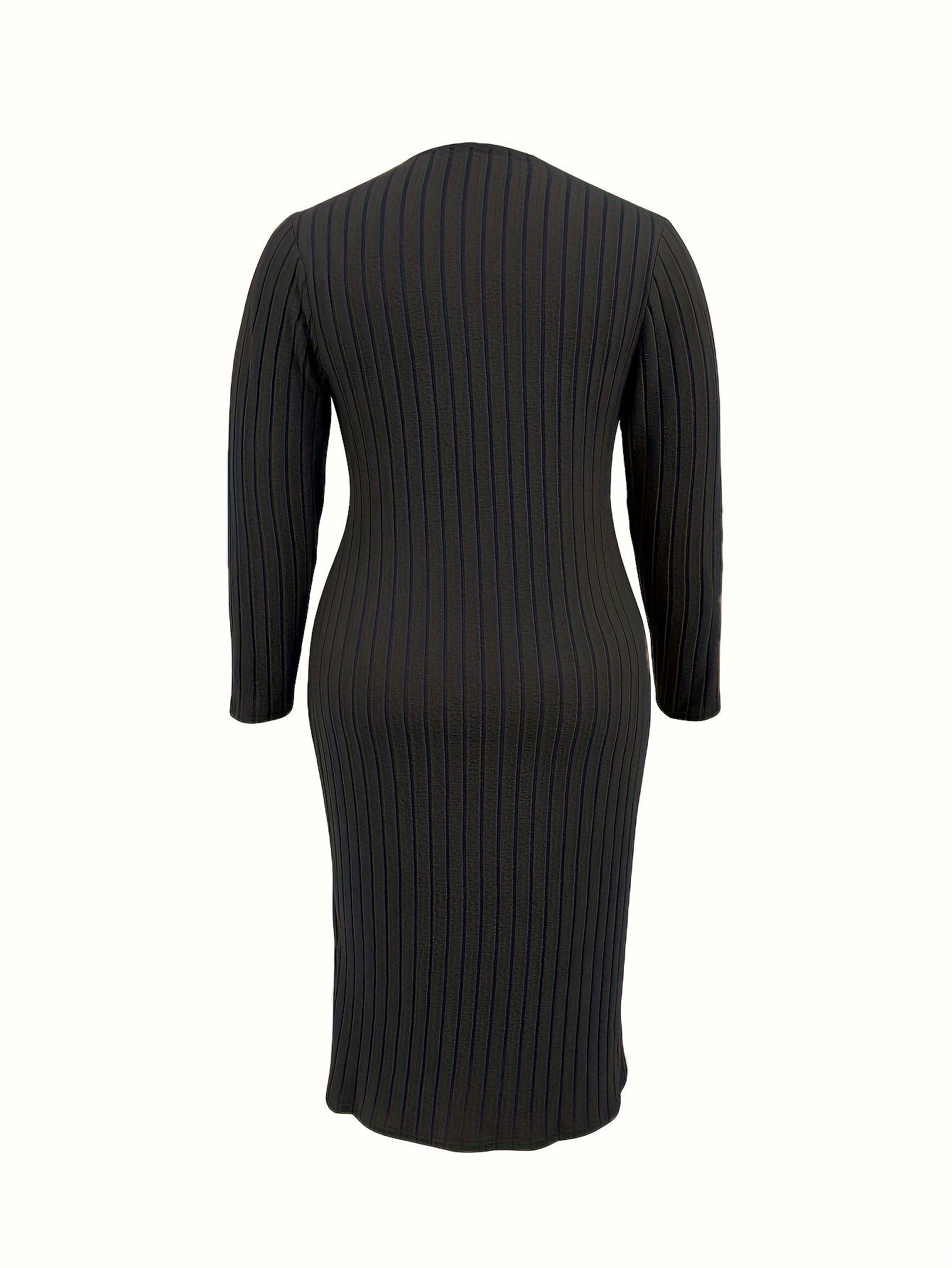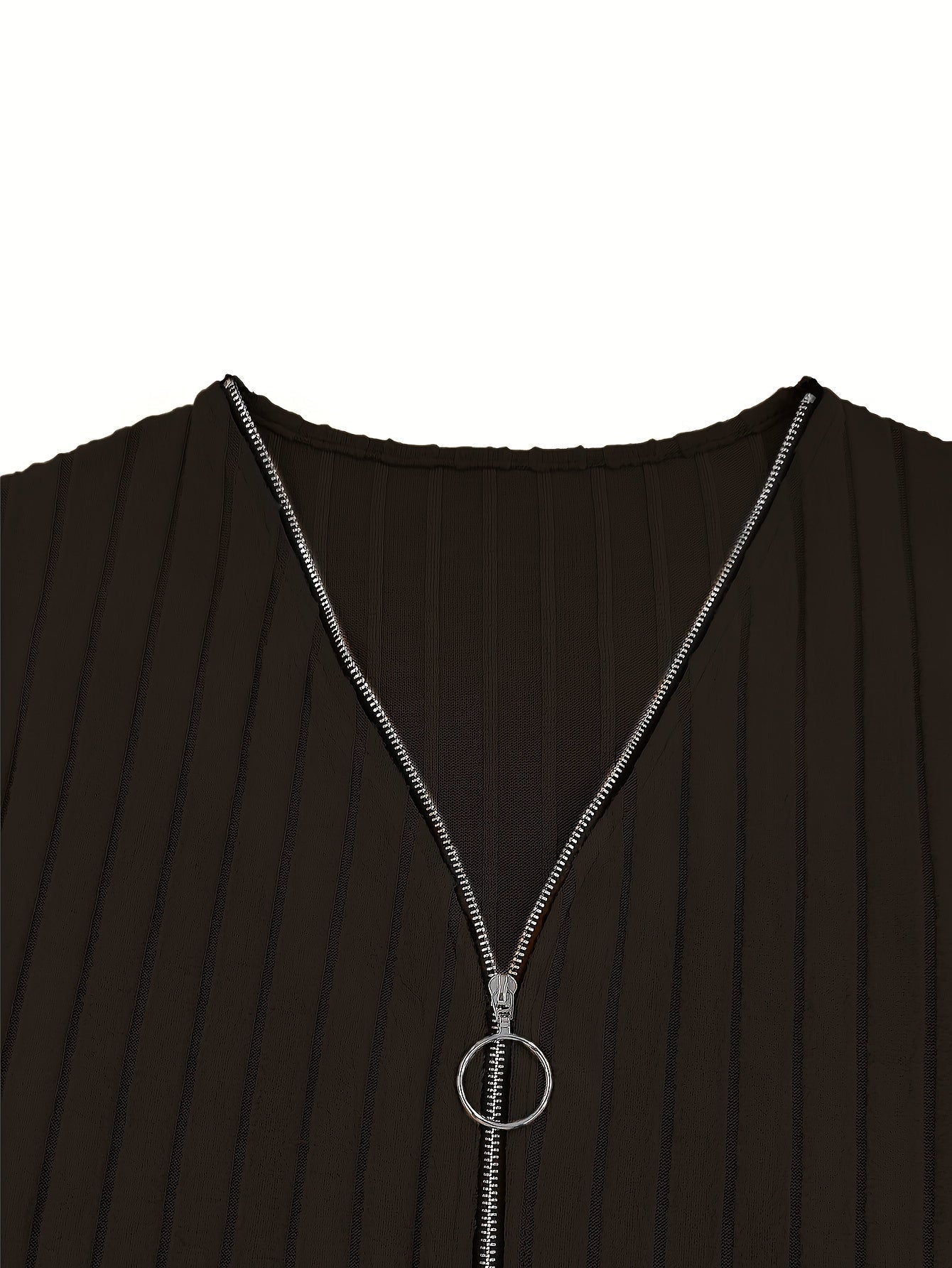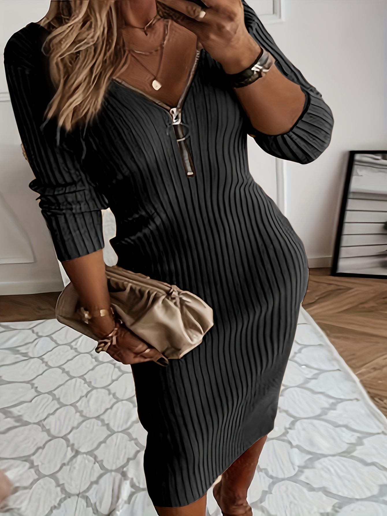 Basic Dress, Women's Solid Ribbed Long Sleeve Zipper V Neck Medium Stretch Bodycon Midi Dress