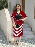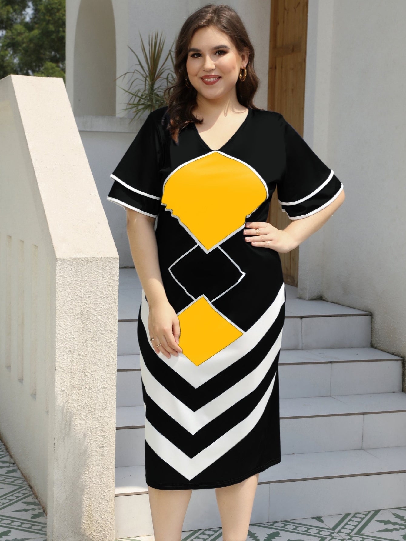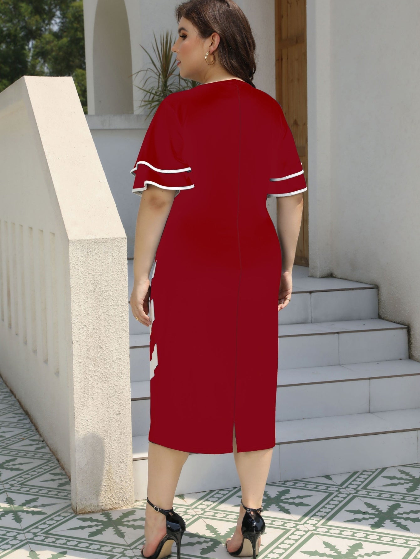 Casual Dress, Women's Colorblock Geometric Print Layered Ruffle Sleeve V Neck Split Hem Medium Stretch Slim Fit Midi Dress