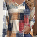 Sale Casual T-shirt, Patchwork Print Long Sleeve V Neck Medium Stretch T-shirt