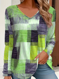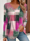 Casual T-shirt, Patchwork Print Long Sleeve V Neck Medium Stretch T-shirt