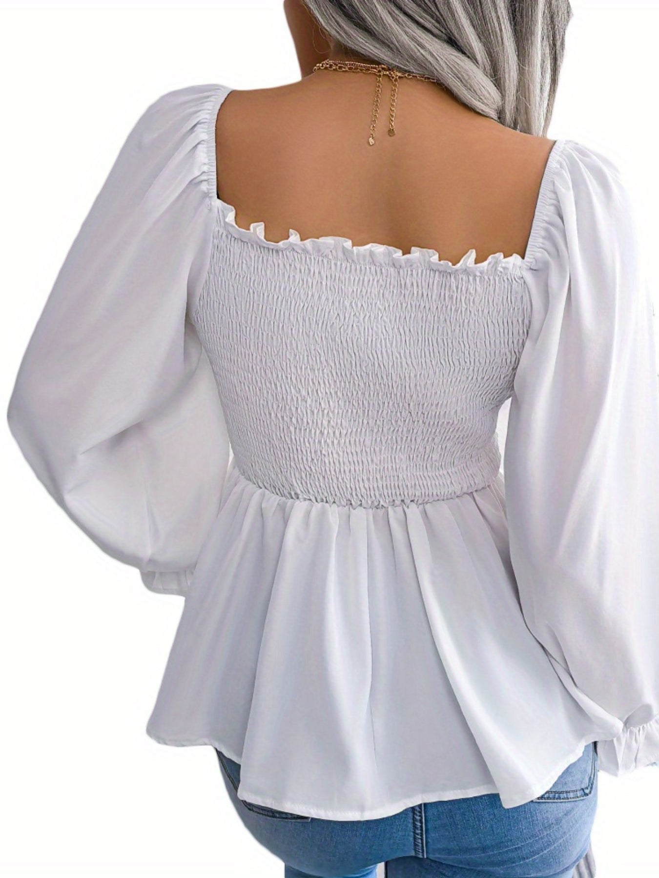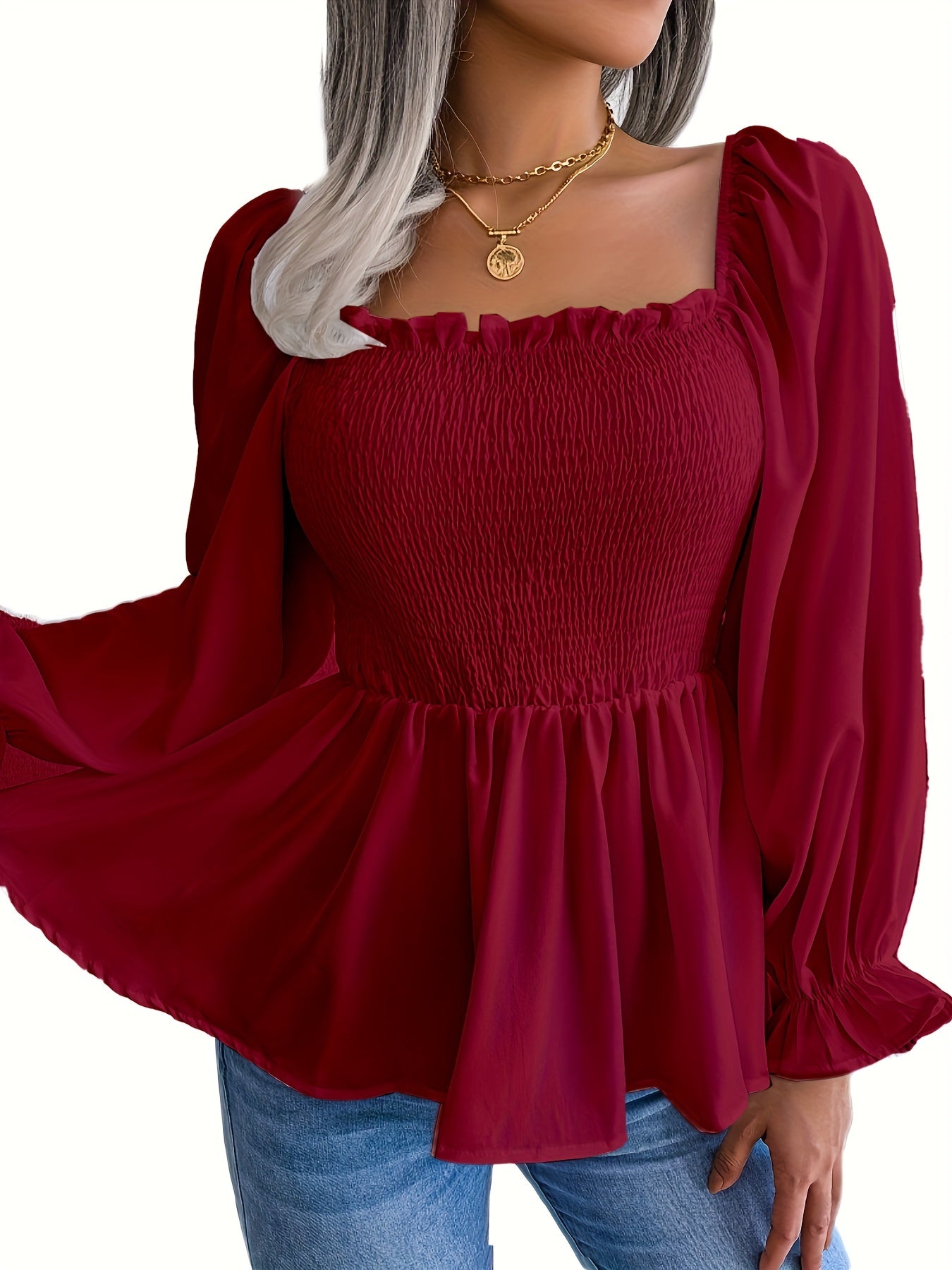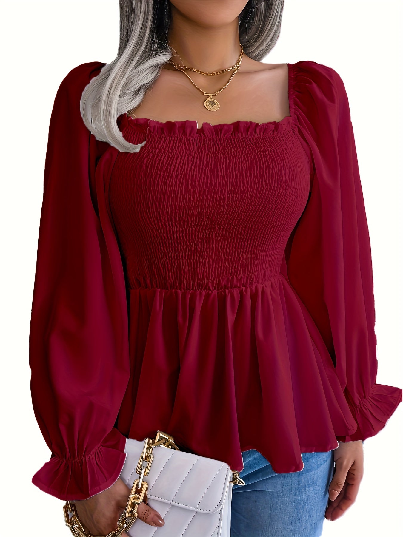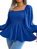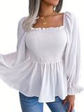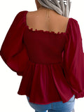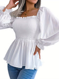Casual Top, Women's Solid Shirred Lantern Sleeve Square Neck Slight Stretch Peplum Top