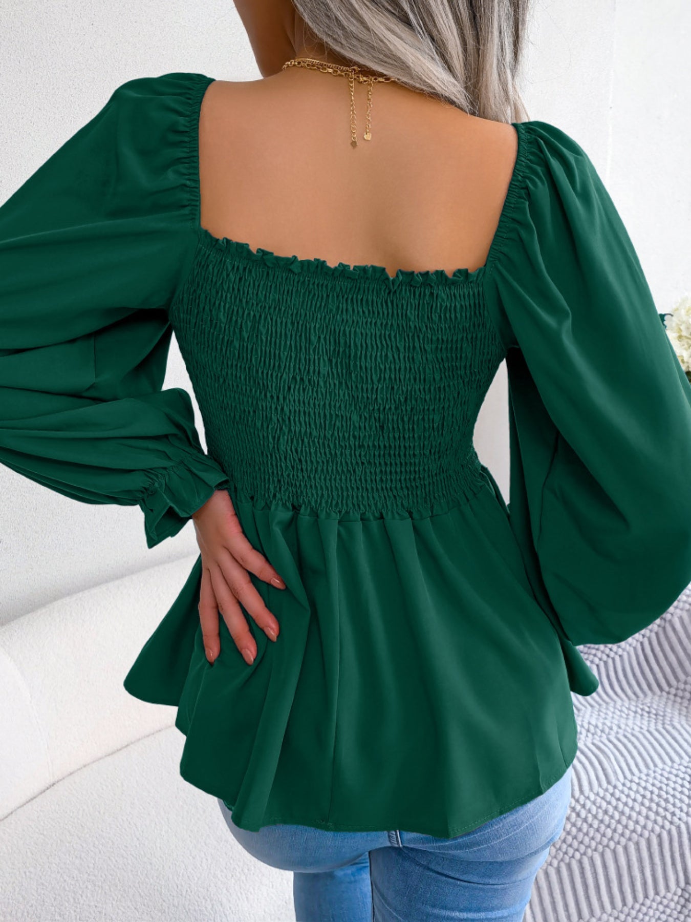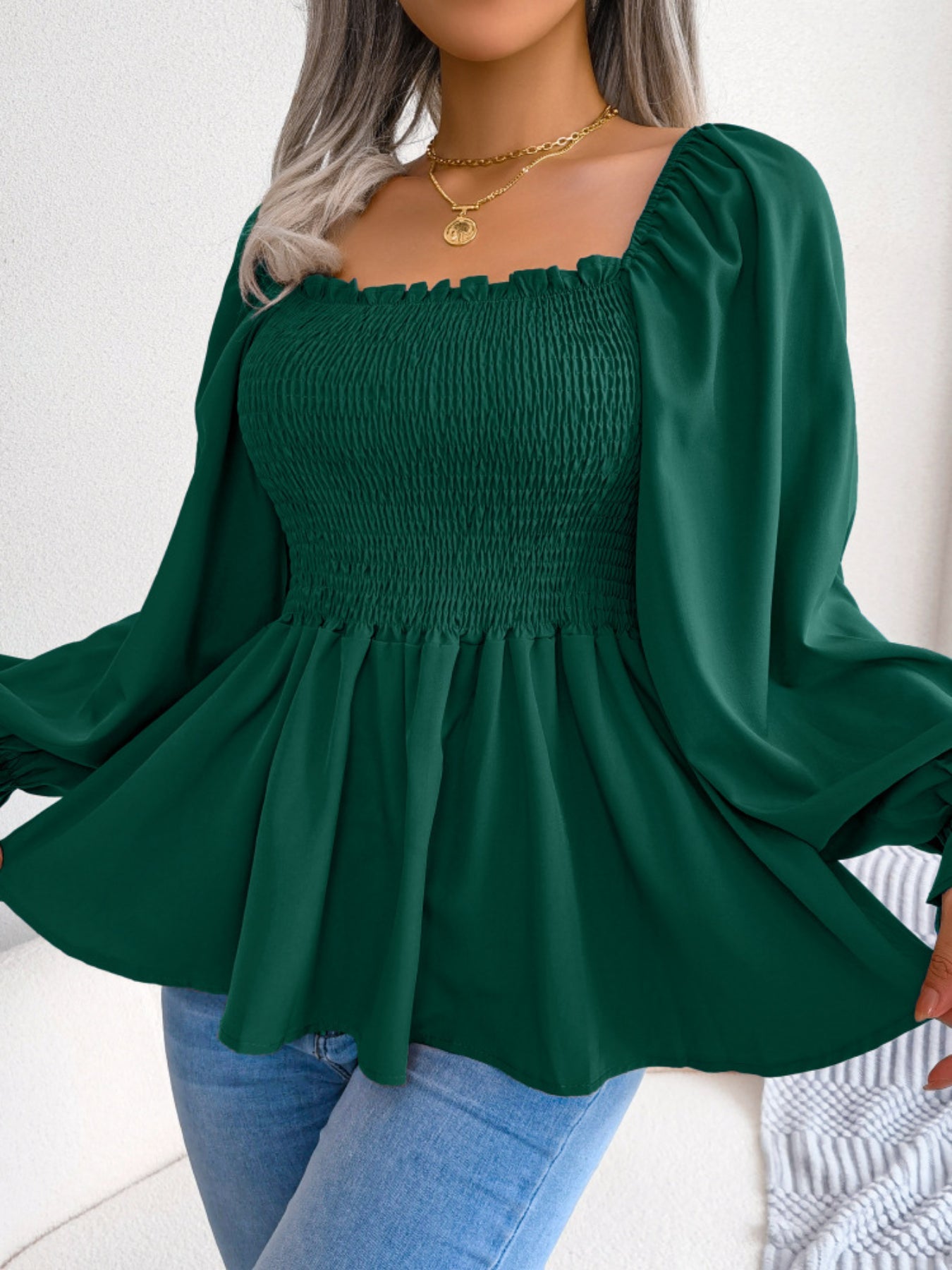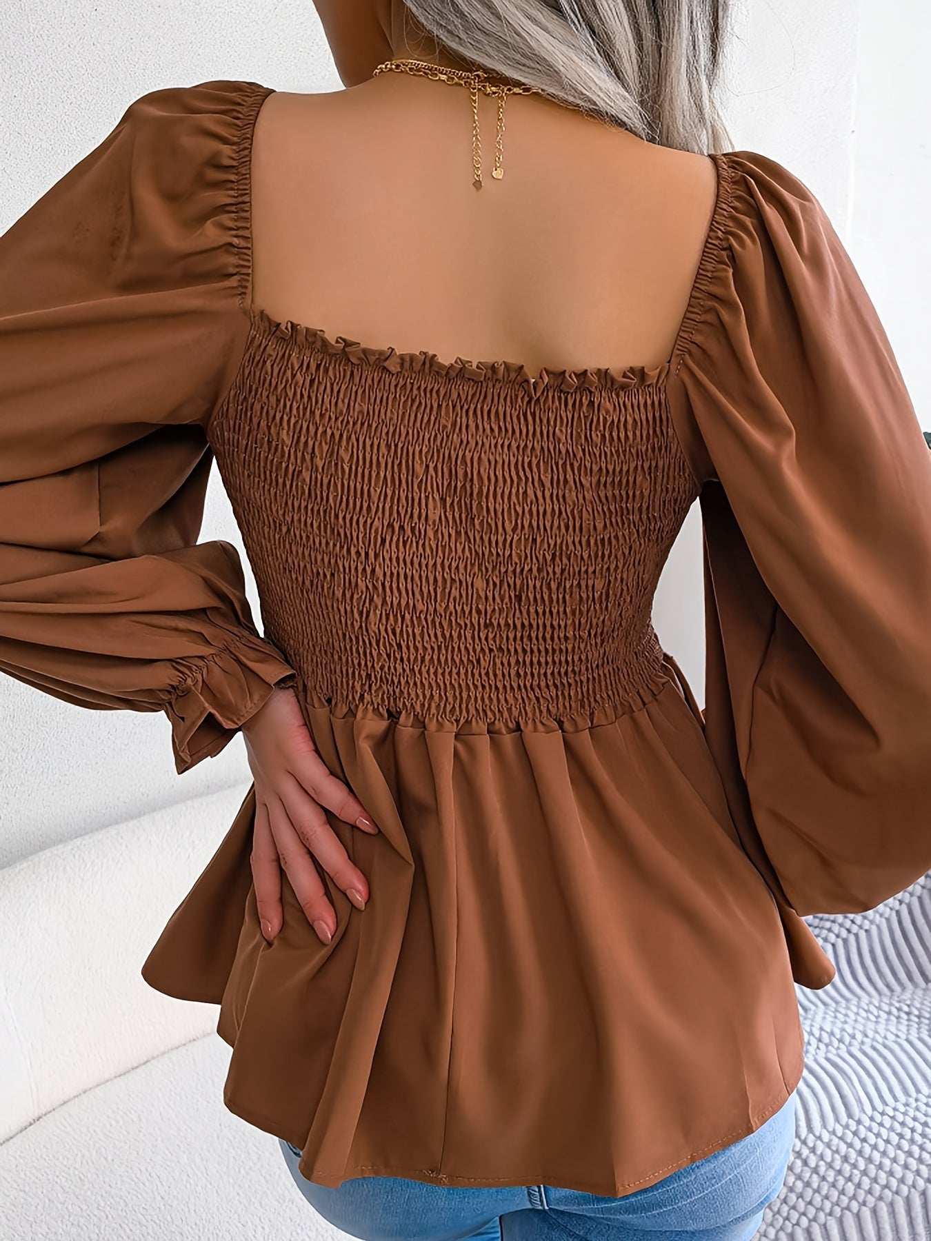 Casual Top, Women's Solid Shirred Lantern Sleeve Square Neck Slight Stretch Peplum Top