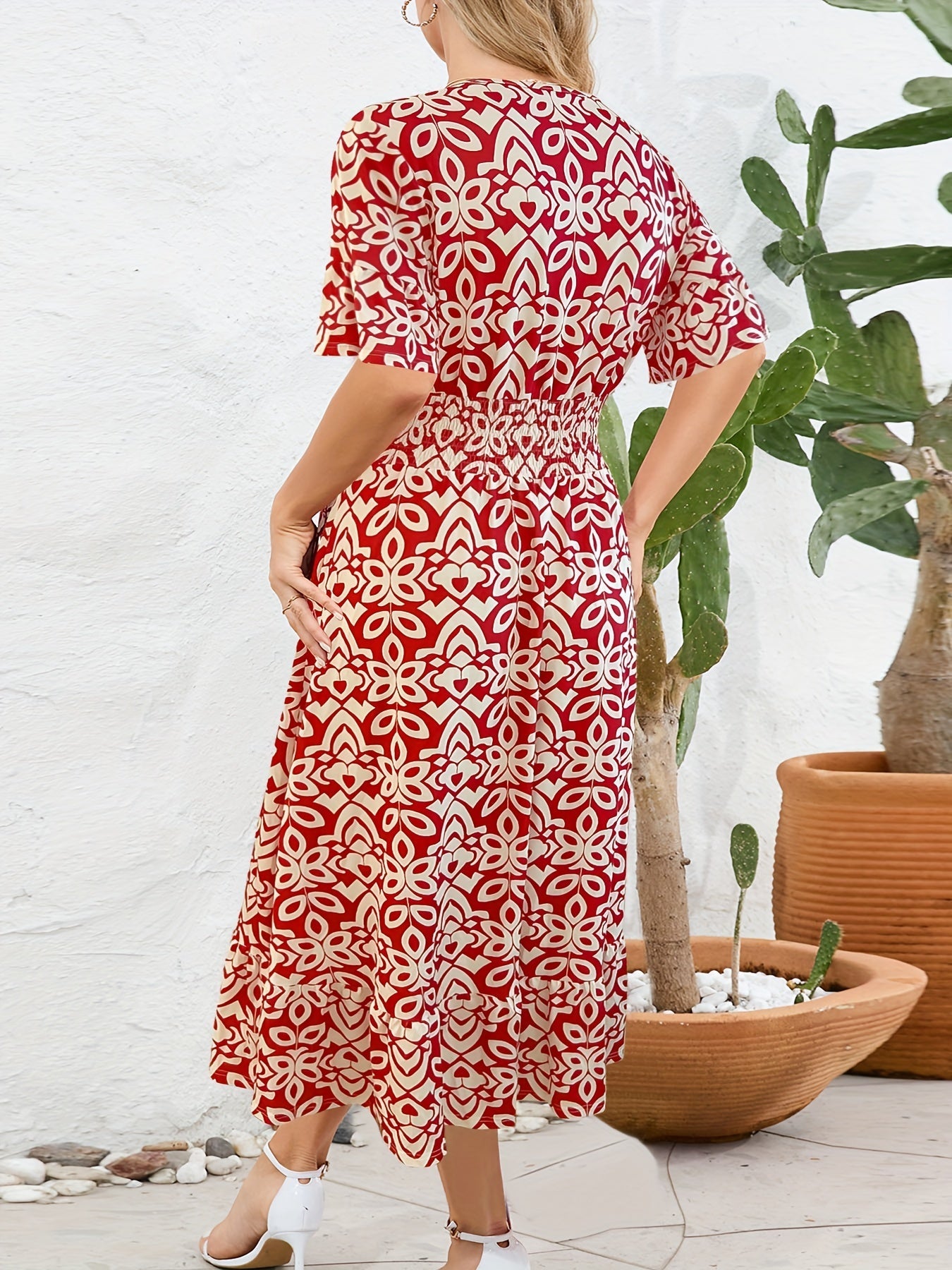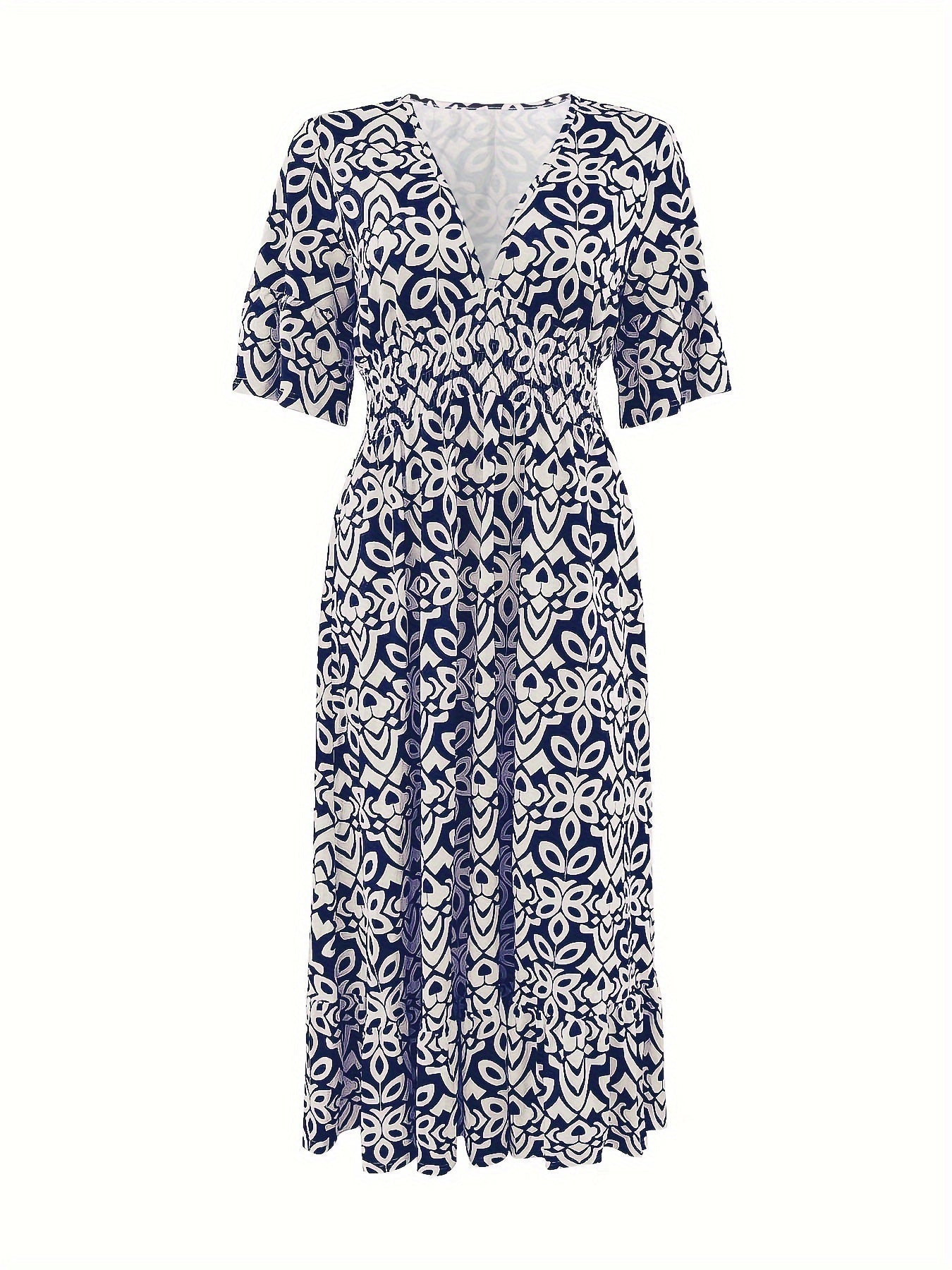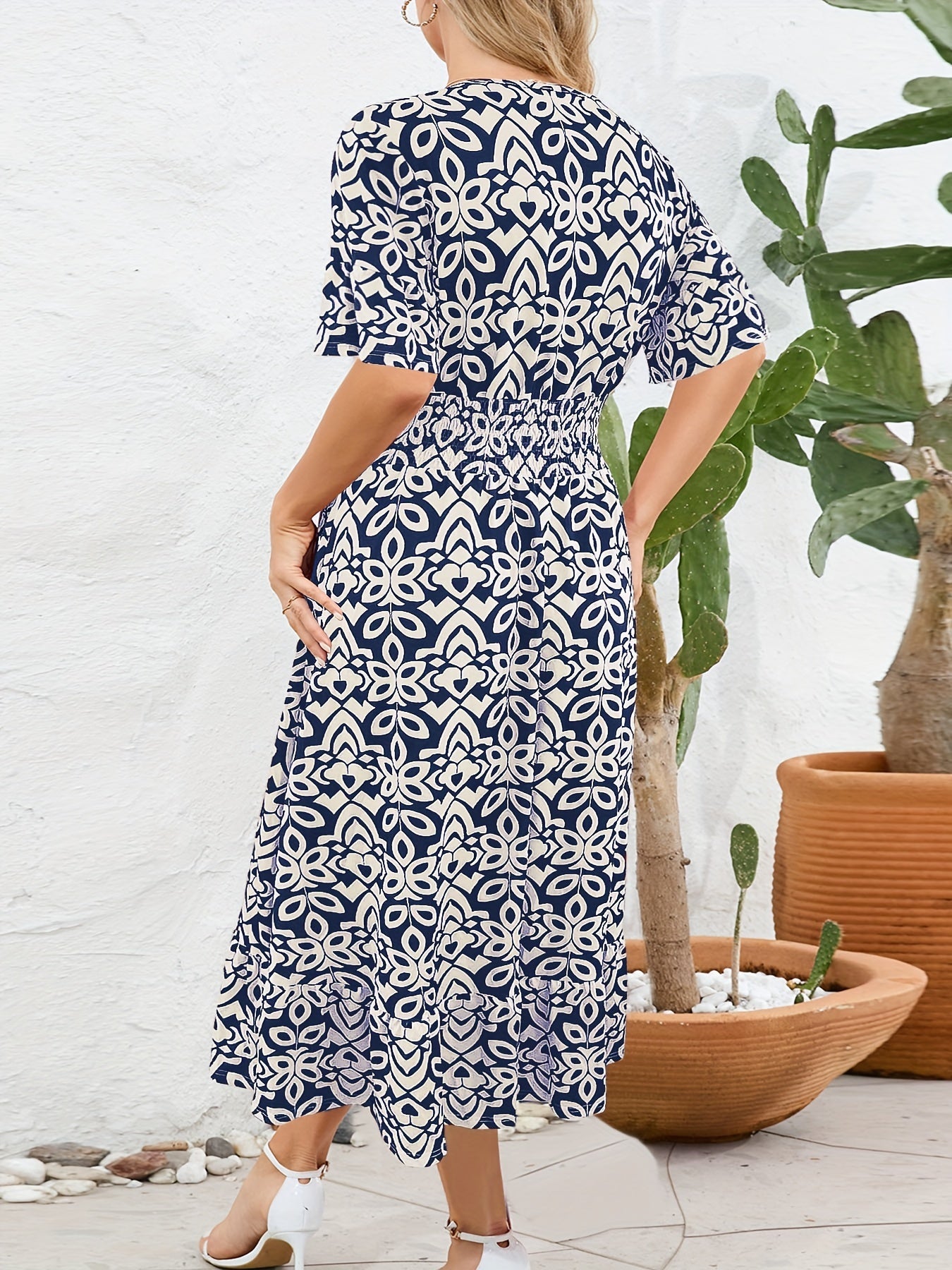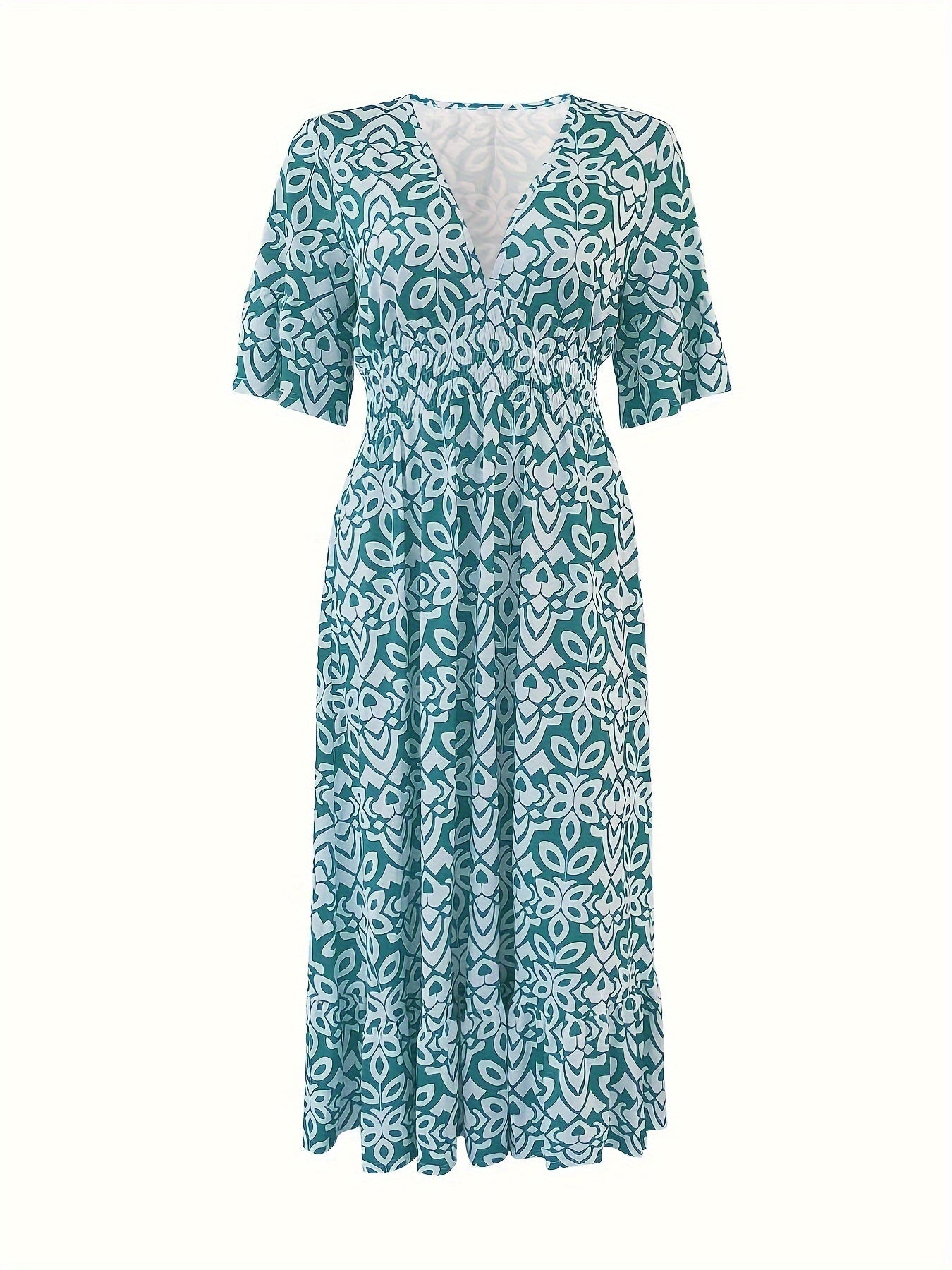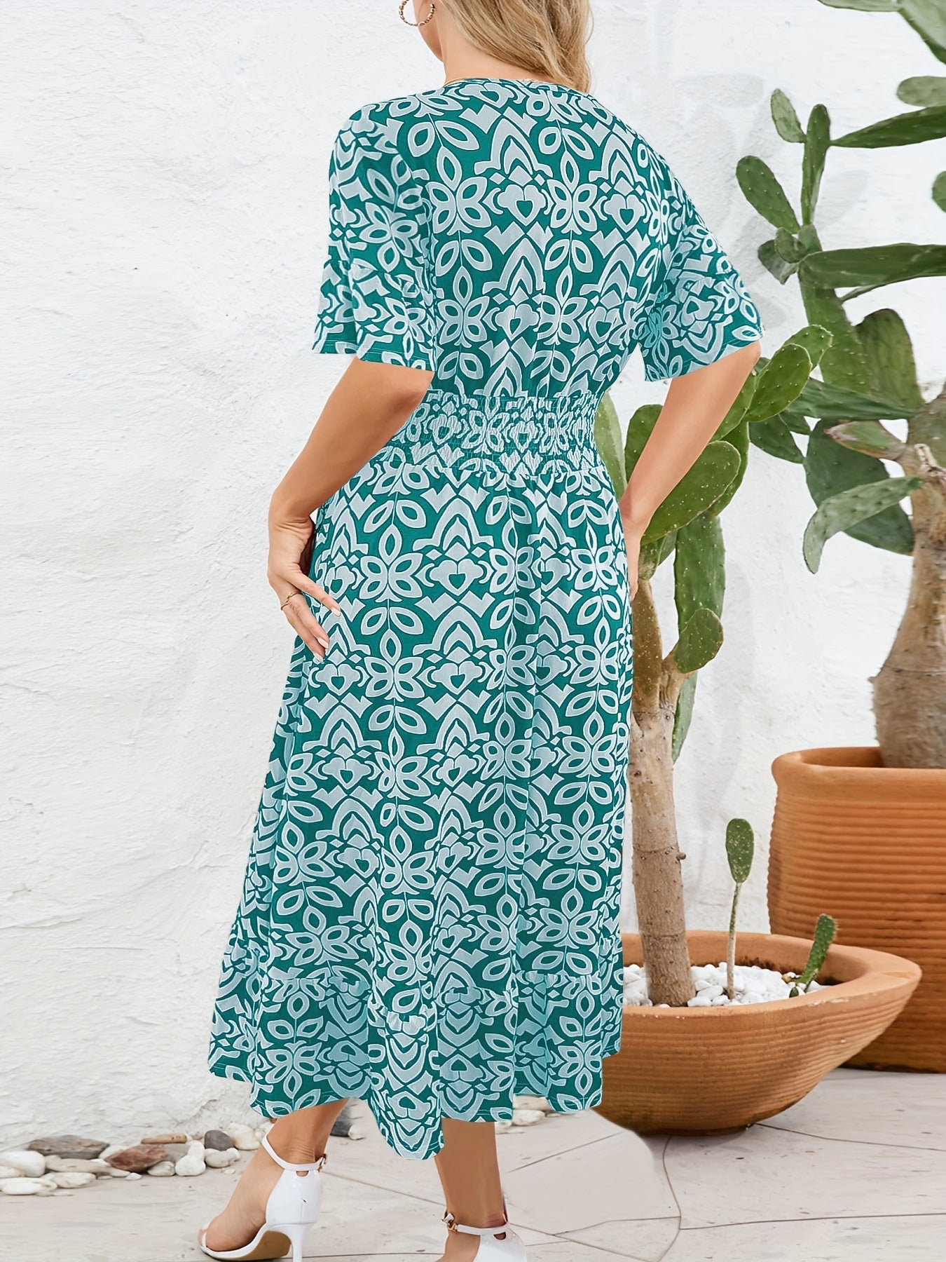 Women's Floral Print Half Sleeve V Neck Slight Stretch Maxi Dress