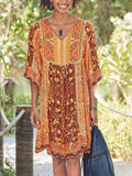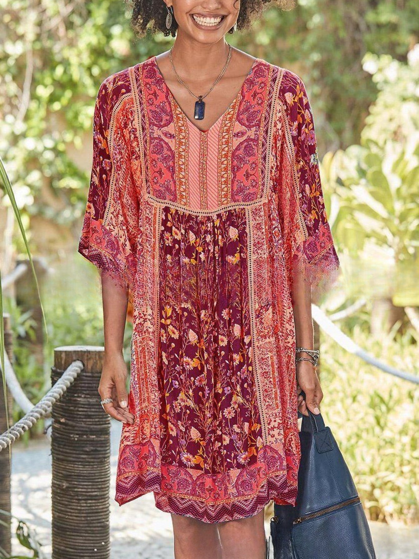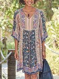 Plus Size Floral Print V Neck Loose Dress, Casual 3/4 Sleeve Dress