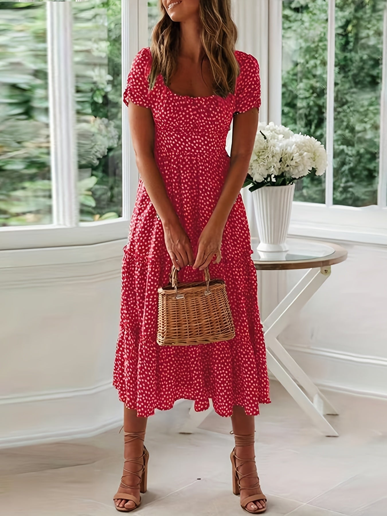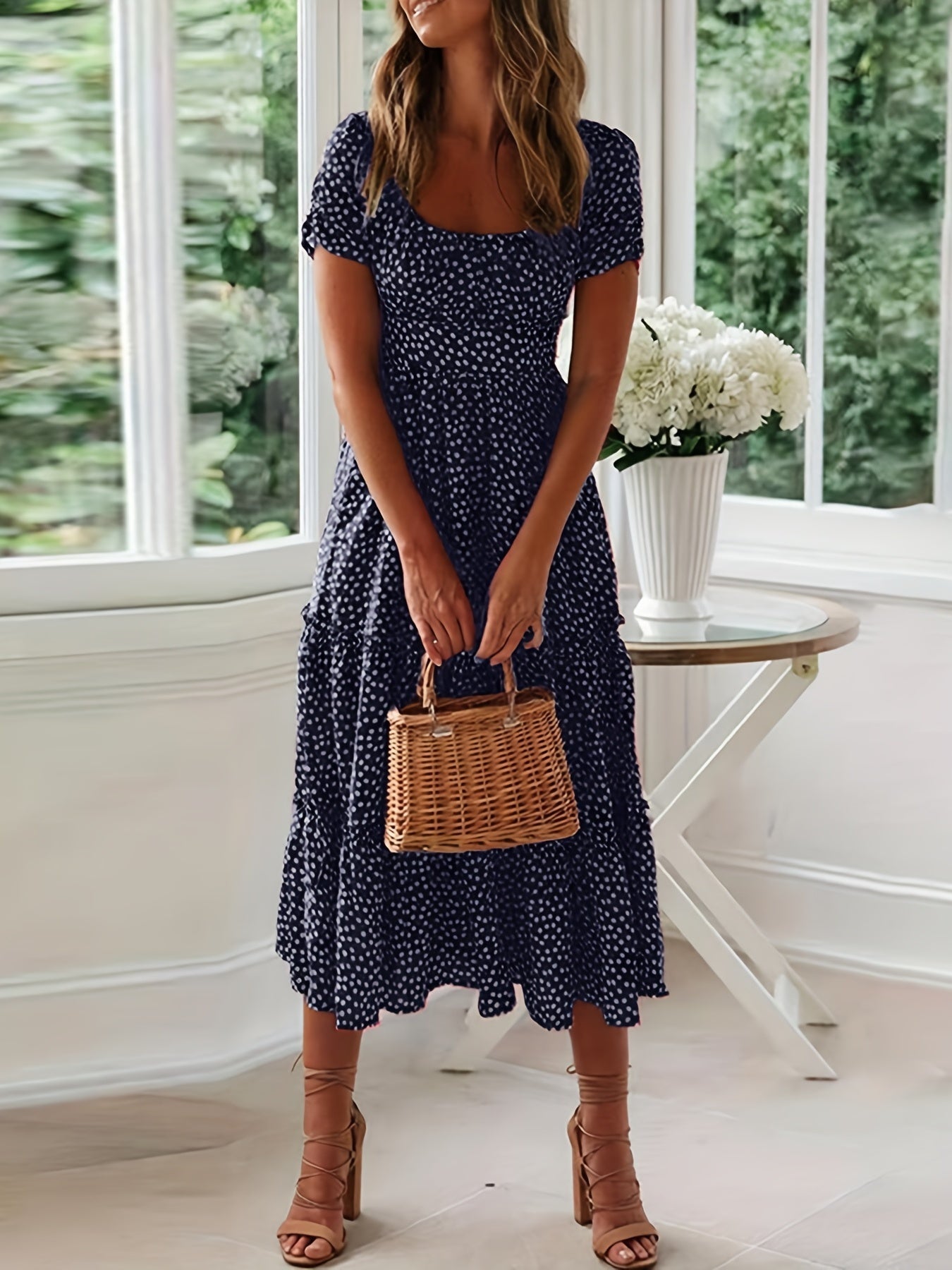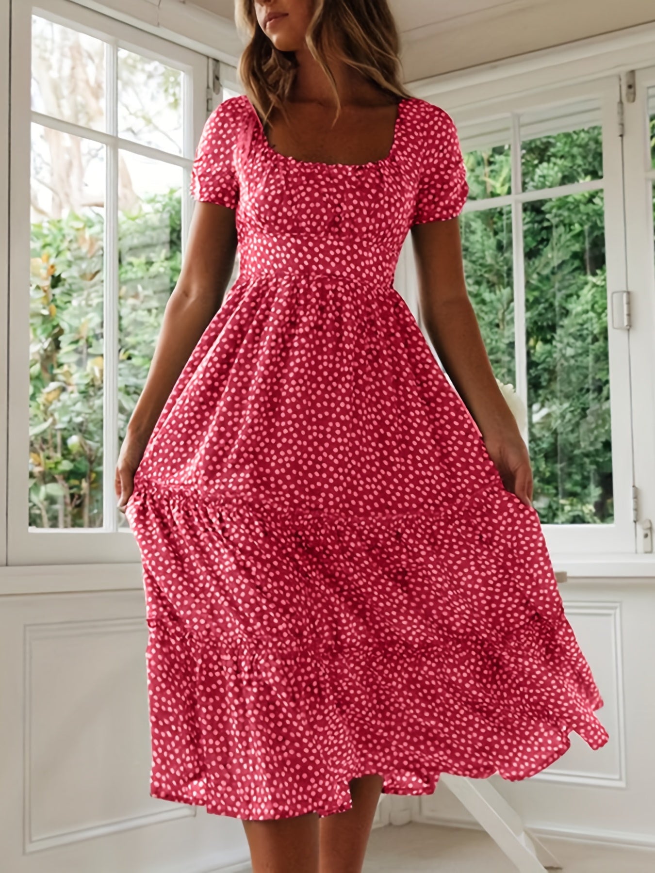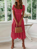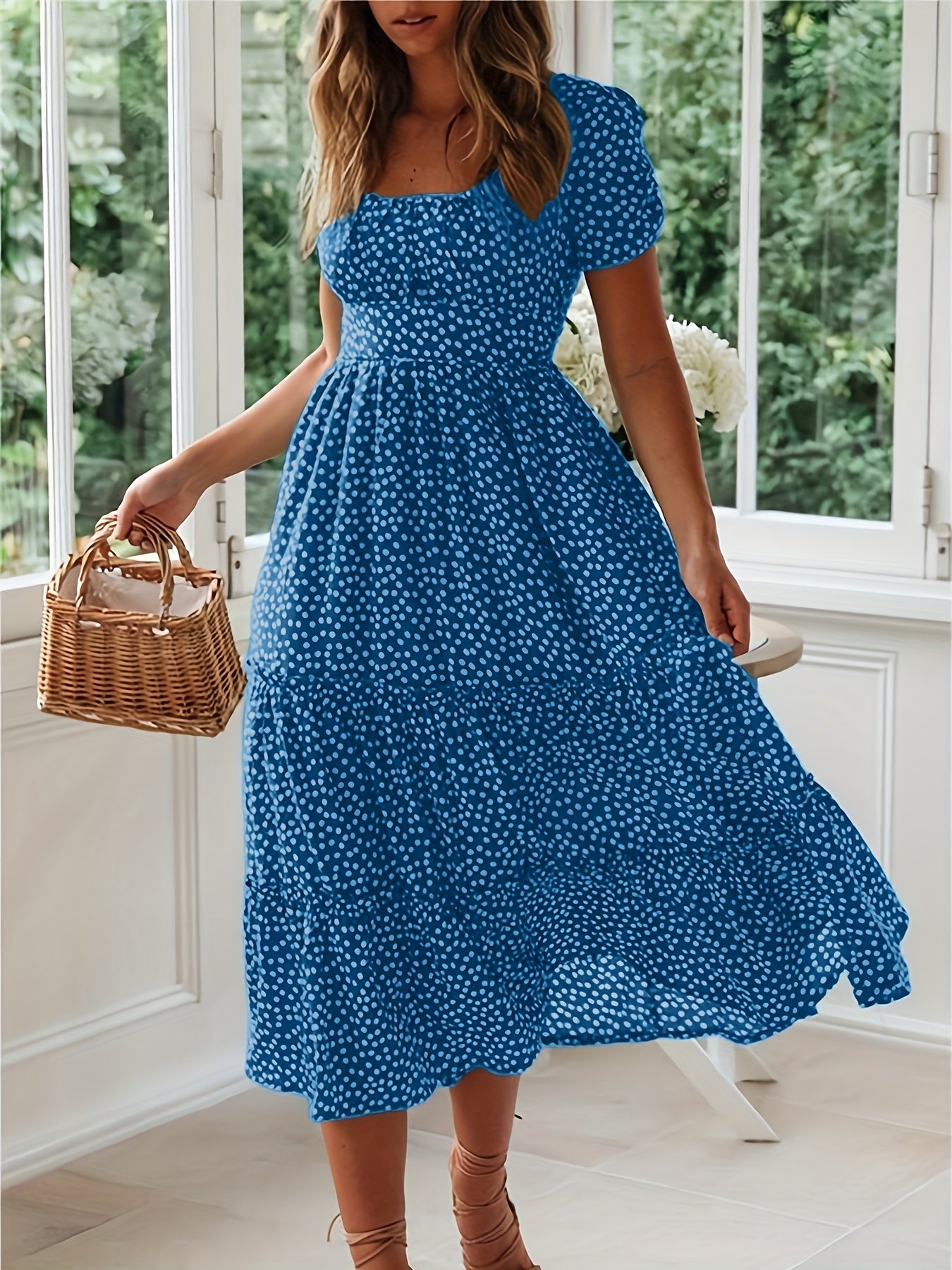 Sale Polka Dot Ruffle Hem Dress, Casual Square Neck Short Sleeve Dress