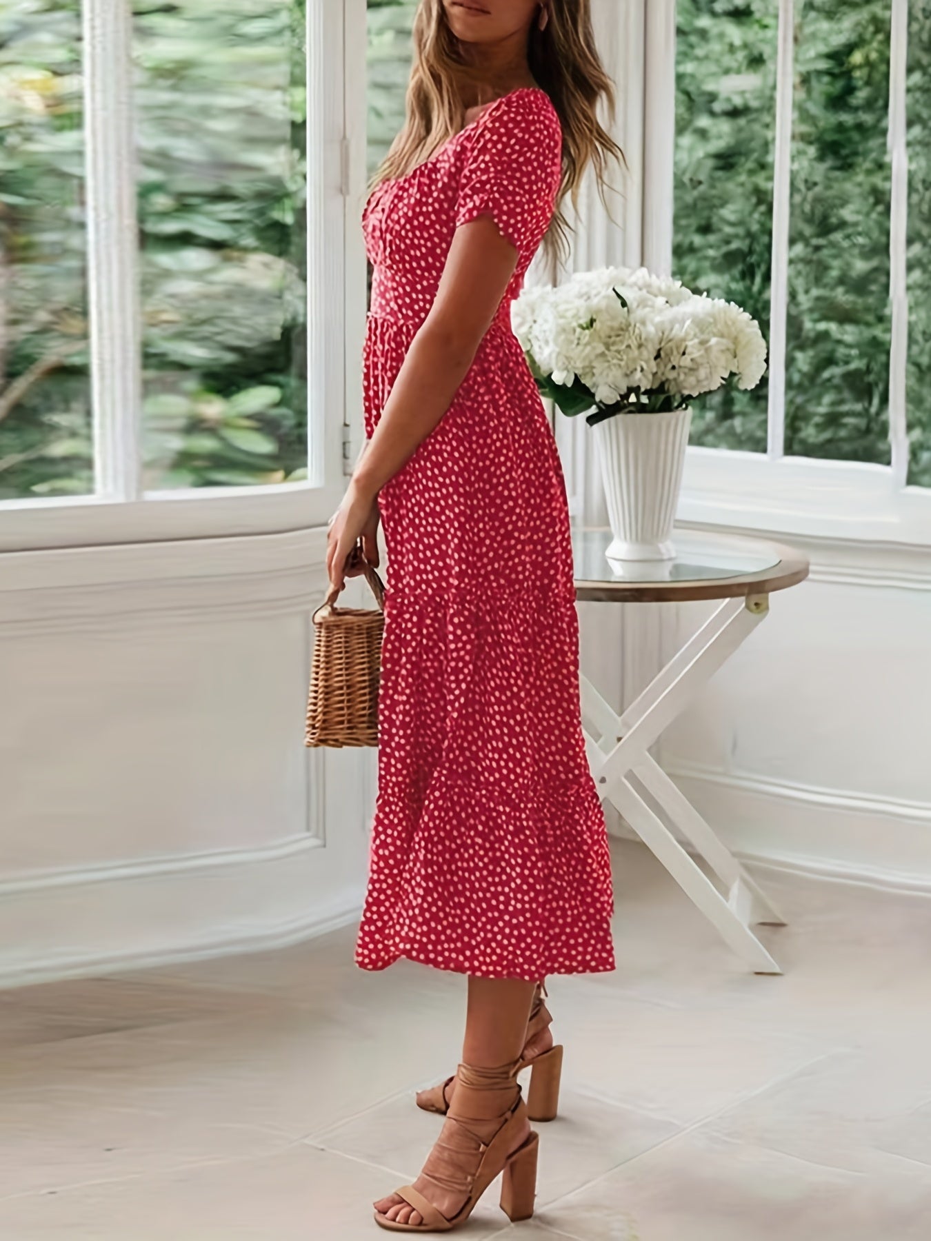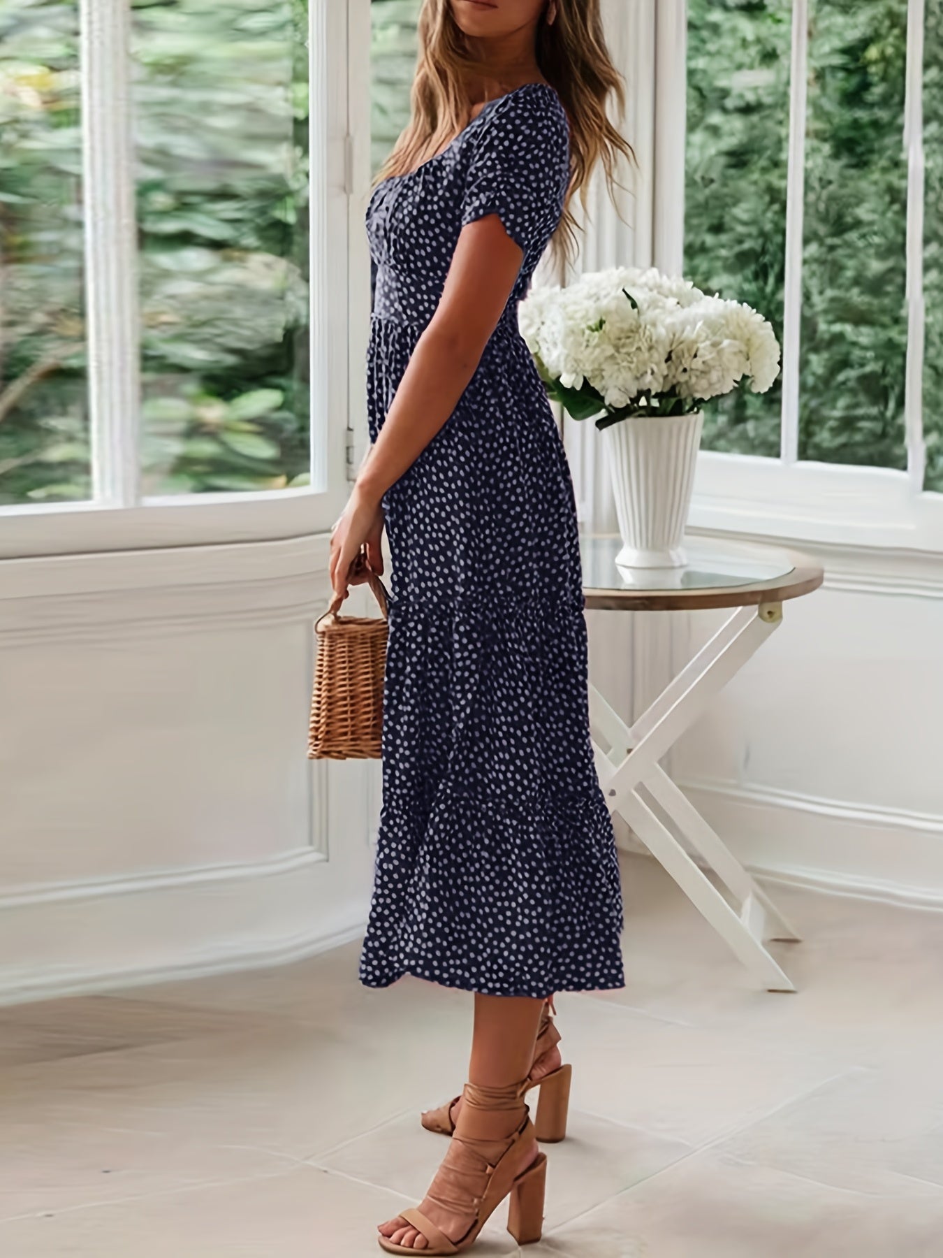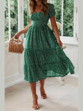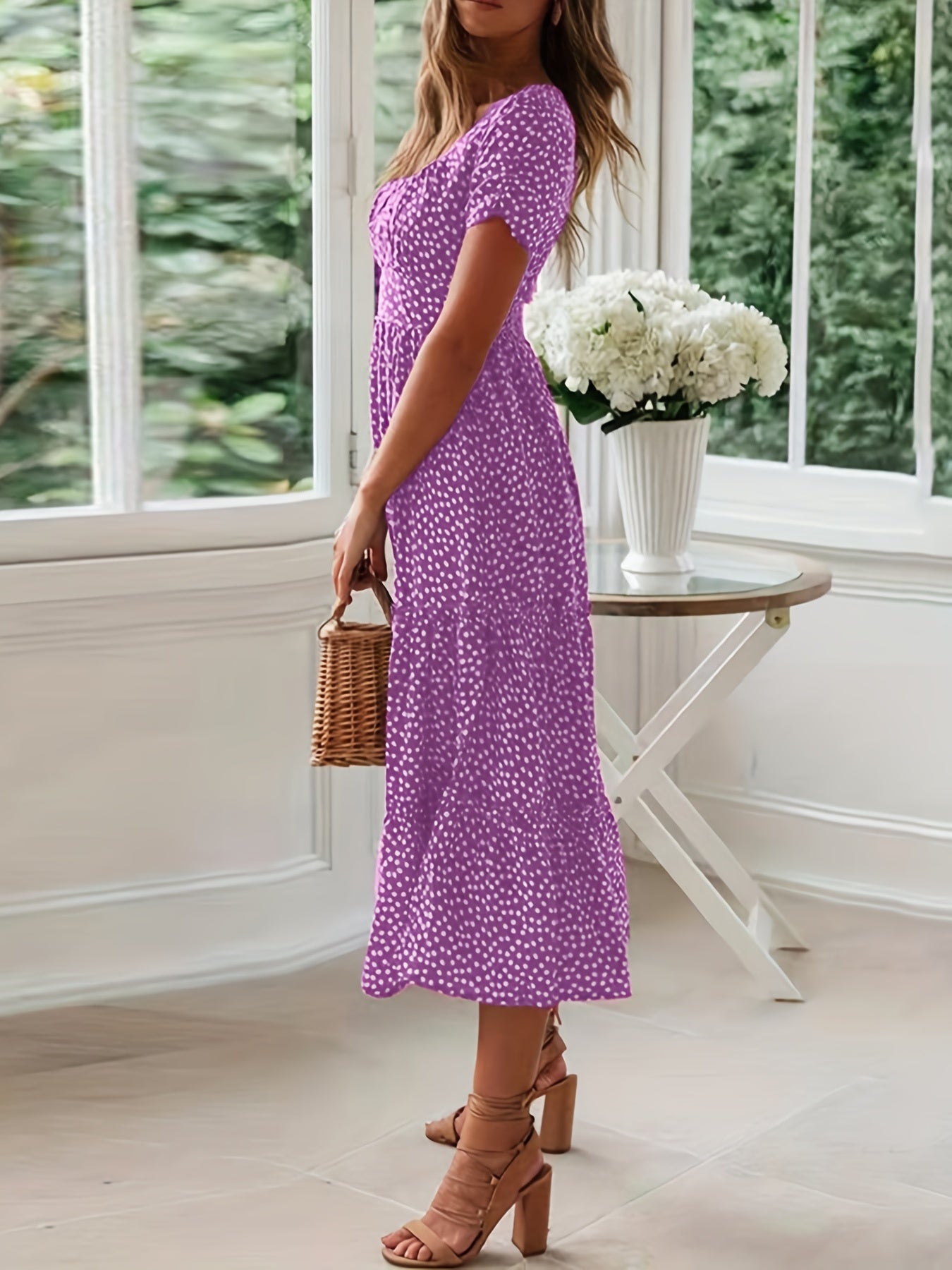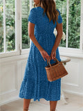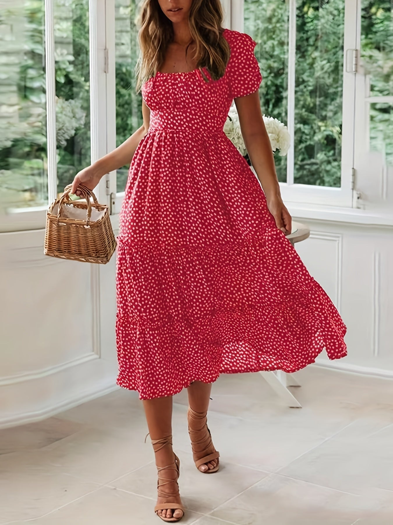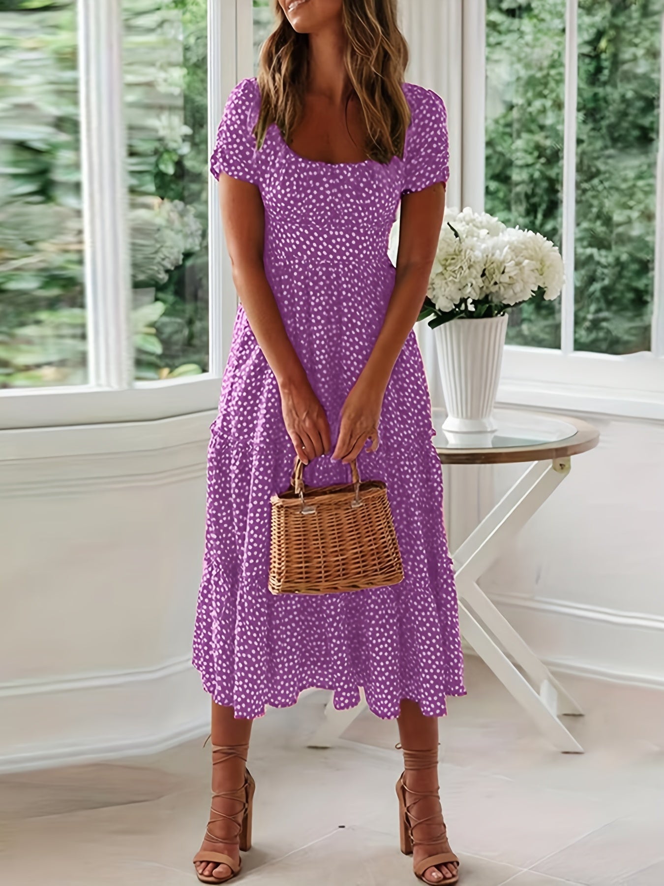 Sale Polka Dot Ruffle Hem Dress, Casual Square Neck Short Sleeve Dress