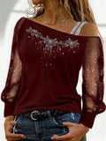 Sale Rhinestones Floral Asymmetrical T-Shirt, Casual Cold Shoulder Mesh Long Sleeve Top