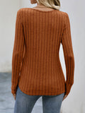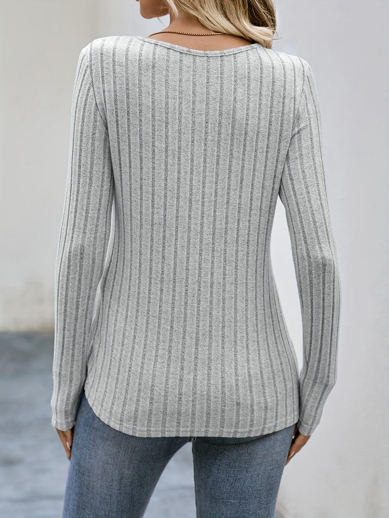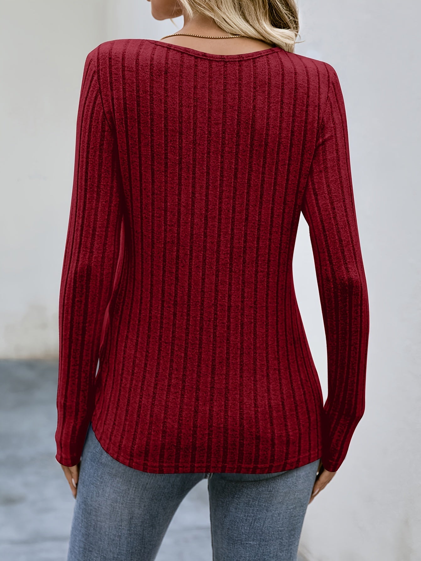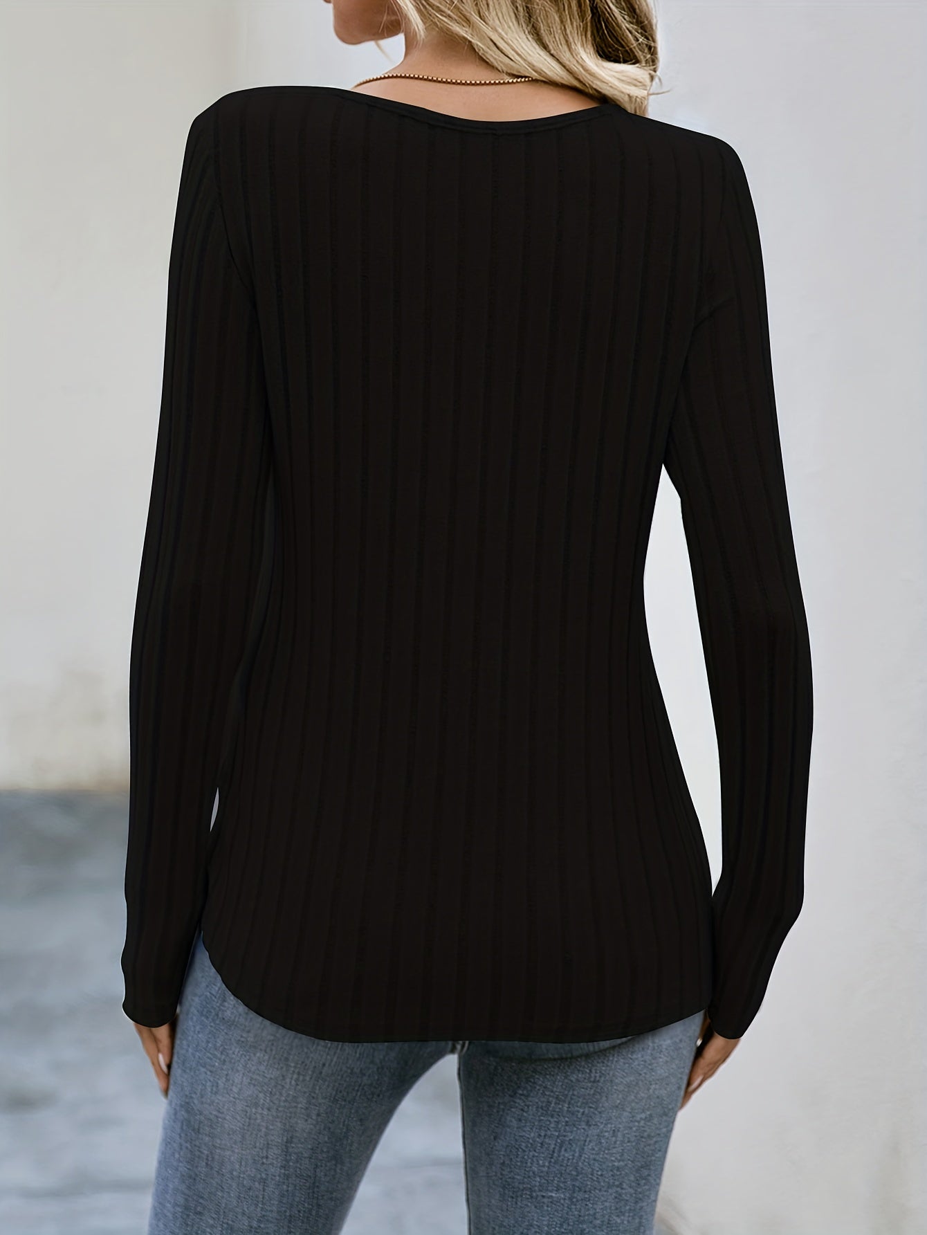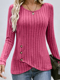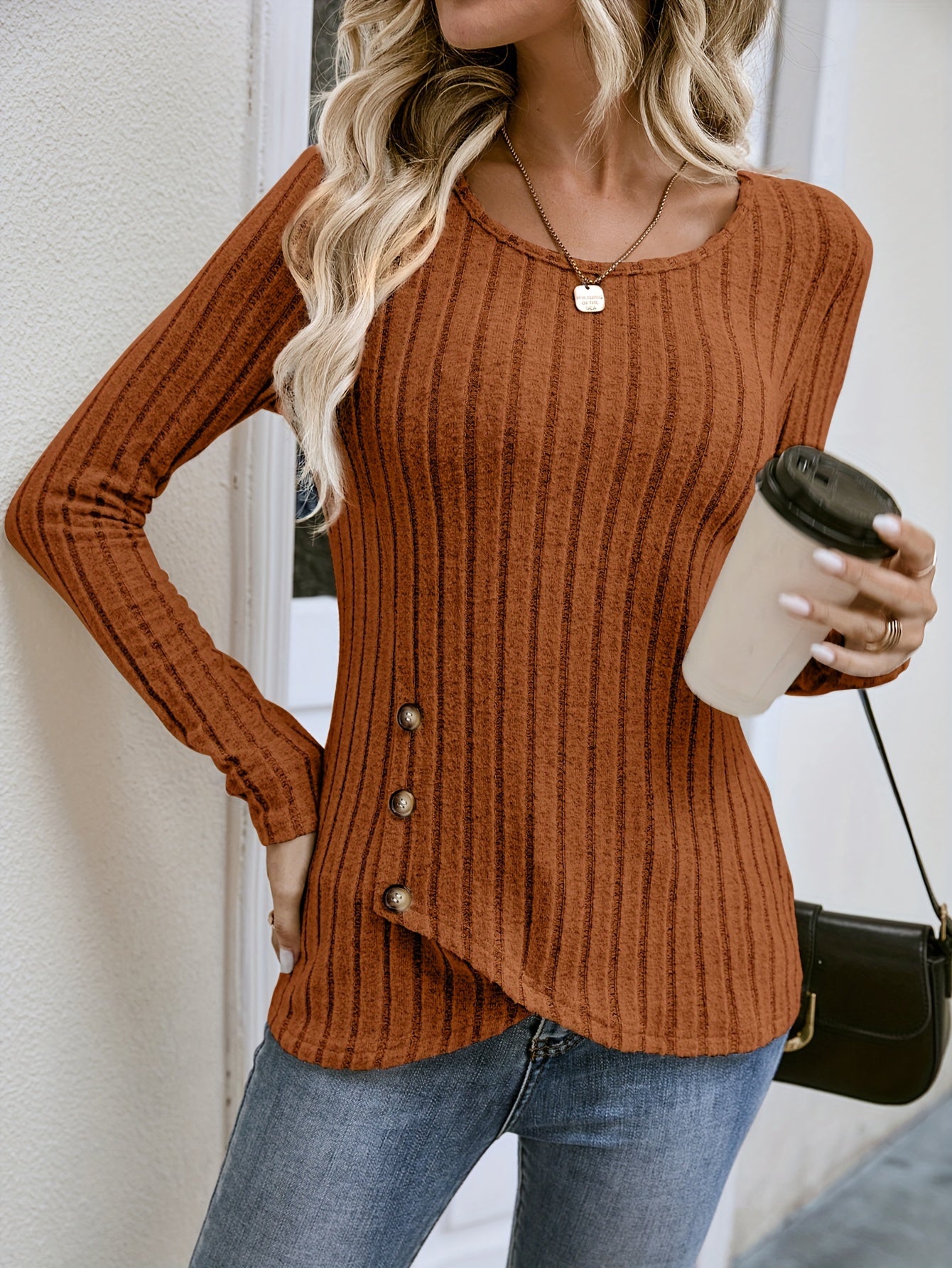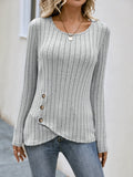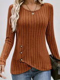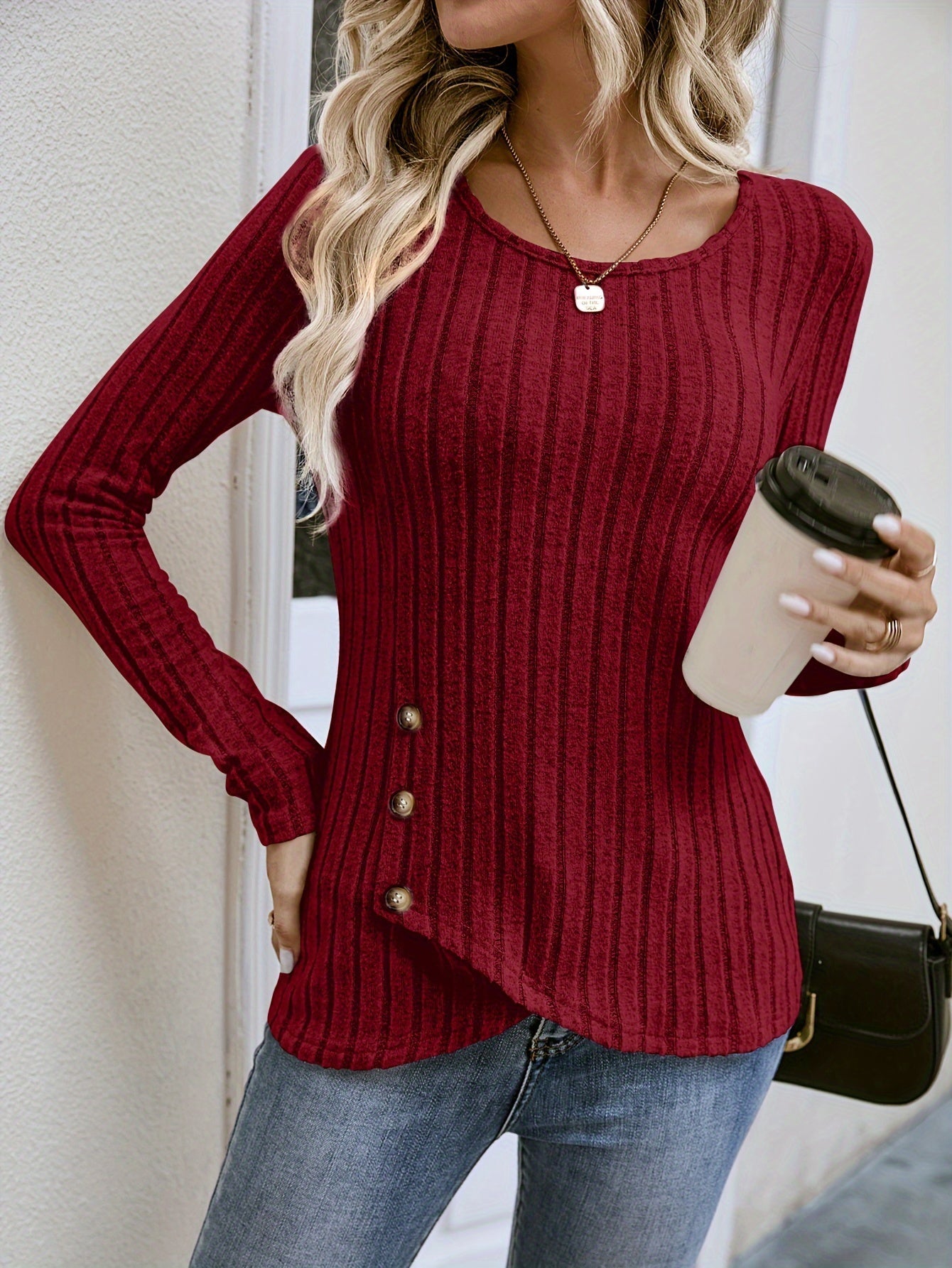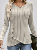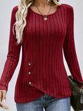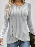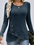 Ribbed Button Decor Crew Neck T-Shirt, Casual Long Sleeve Top