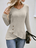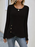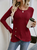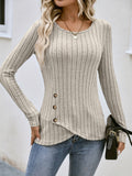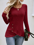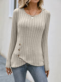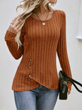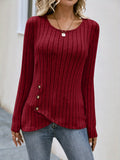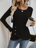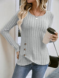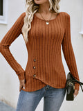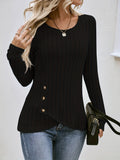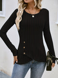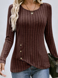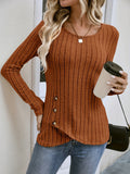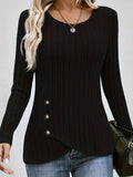 Sale Ribbed Button Decor Crew Neck T-Shirt, Casual Long Sleeve Top
