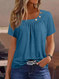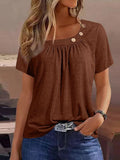 Sale Solid Pleated Trim Blouse, Casual Crew Neck Short Sleeve Blouse