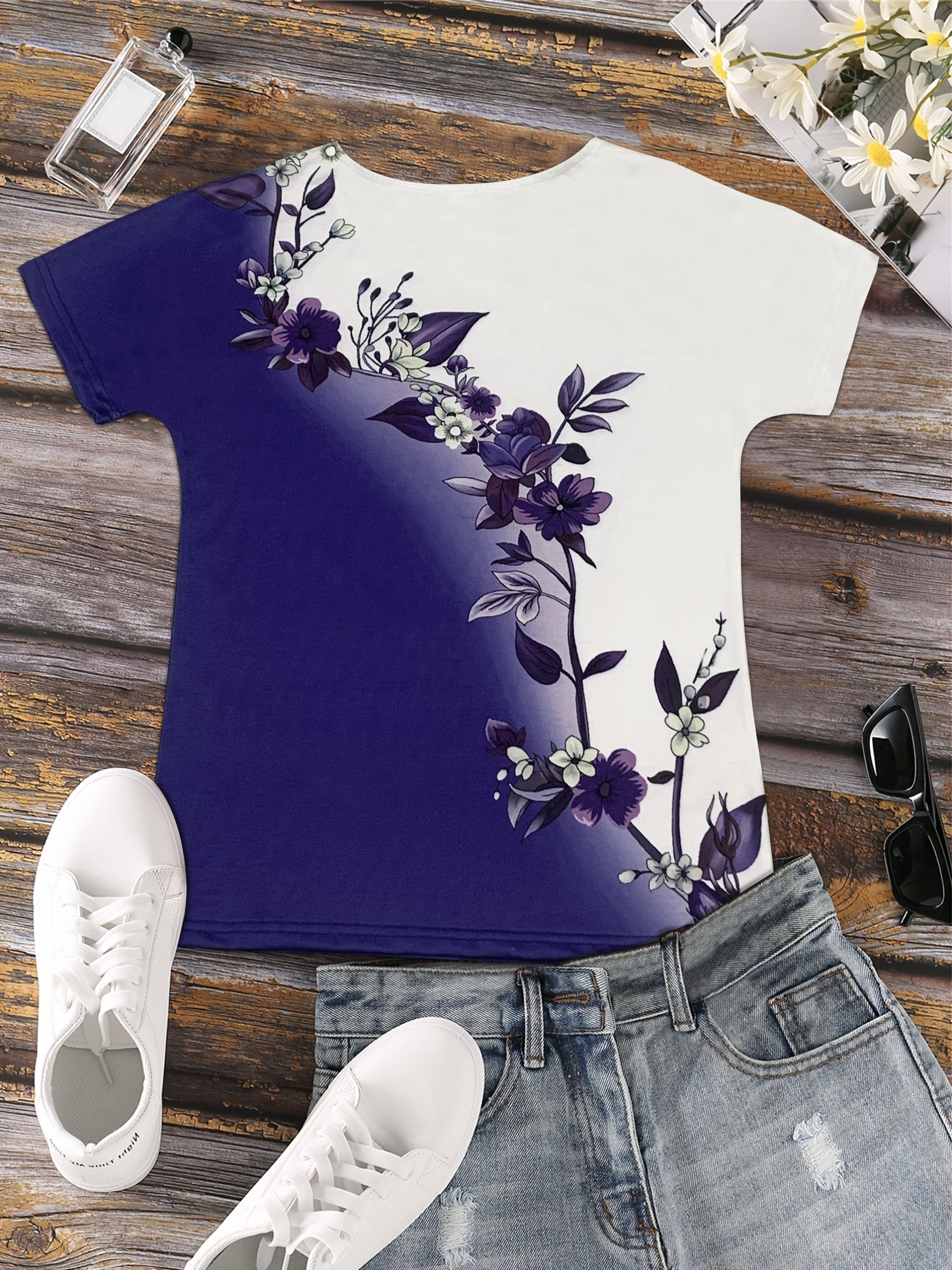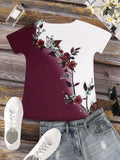 Short Sleeve Floral Print Colorblock Crew Neck T-Shirt