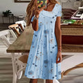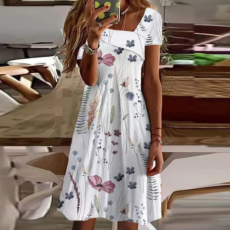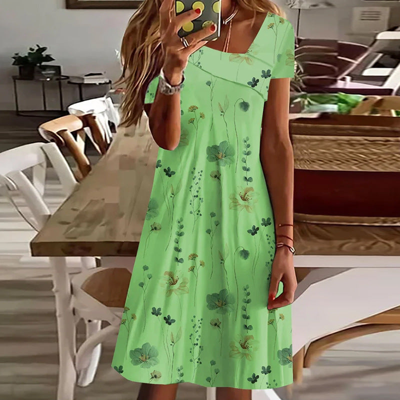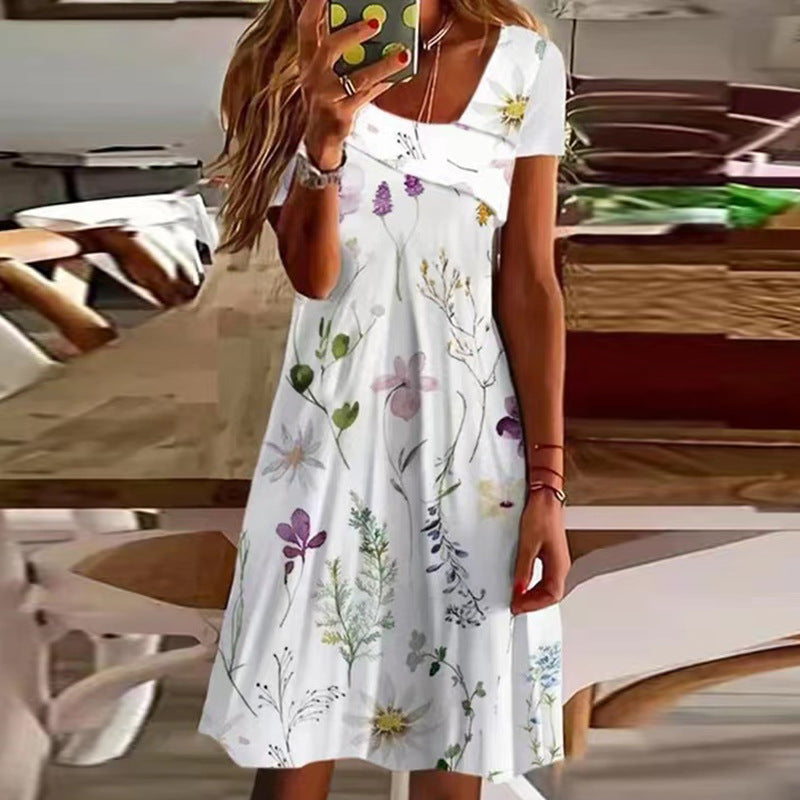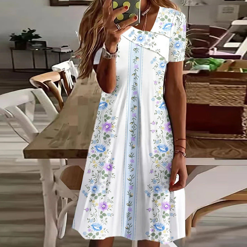 Short Sleeve Printed A Line Mid Waist V-Neck Mini Dress