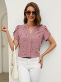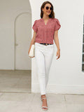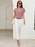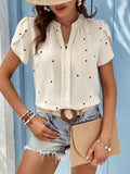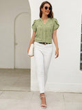 Sale Solid Pleated Trim Blouse, Casual Crew Neck Short Sleeve Blouse