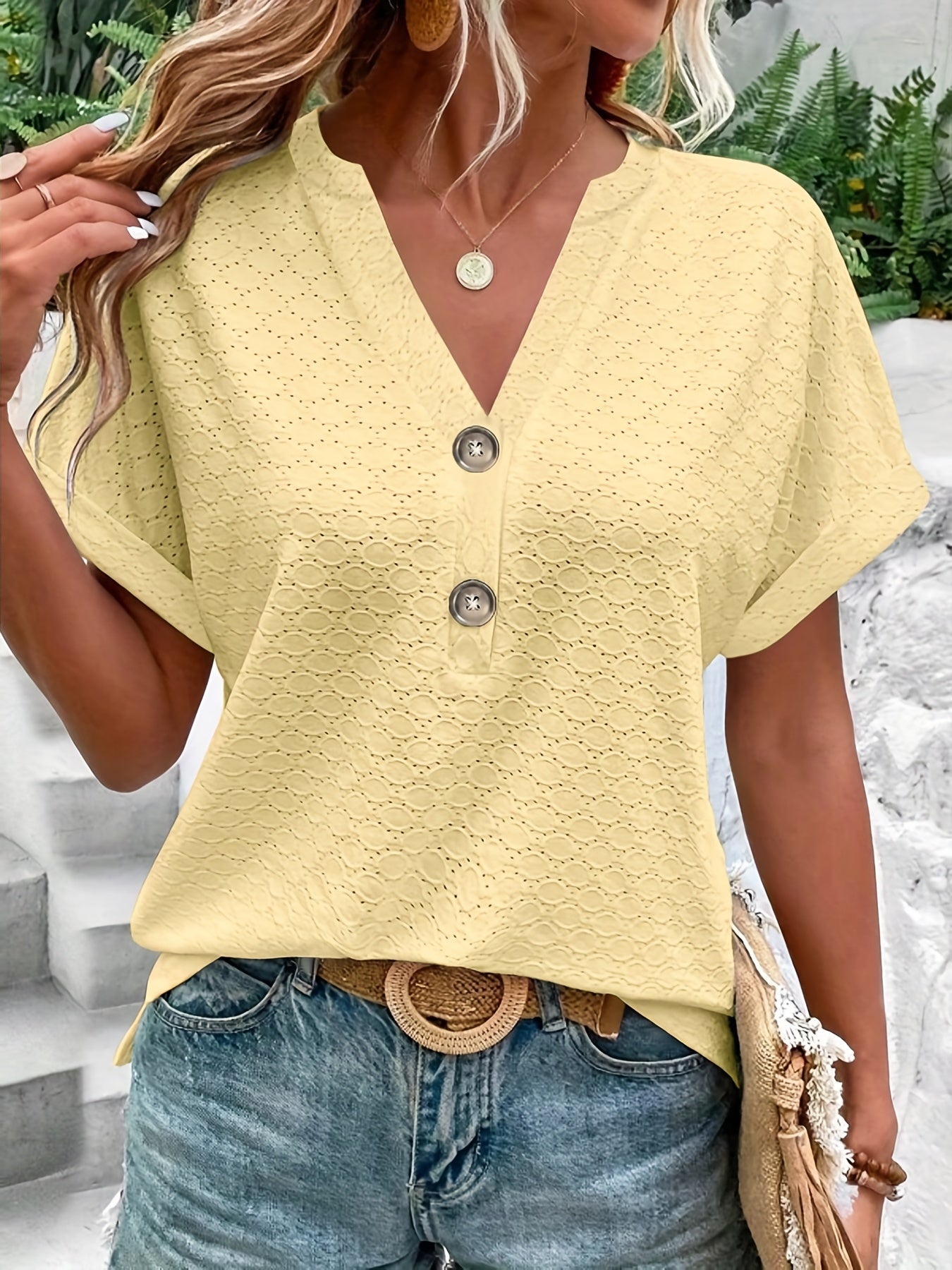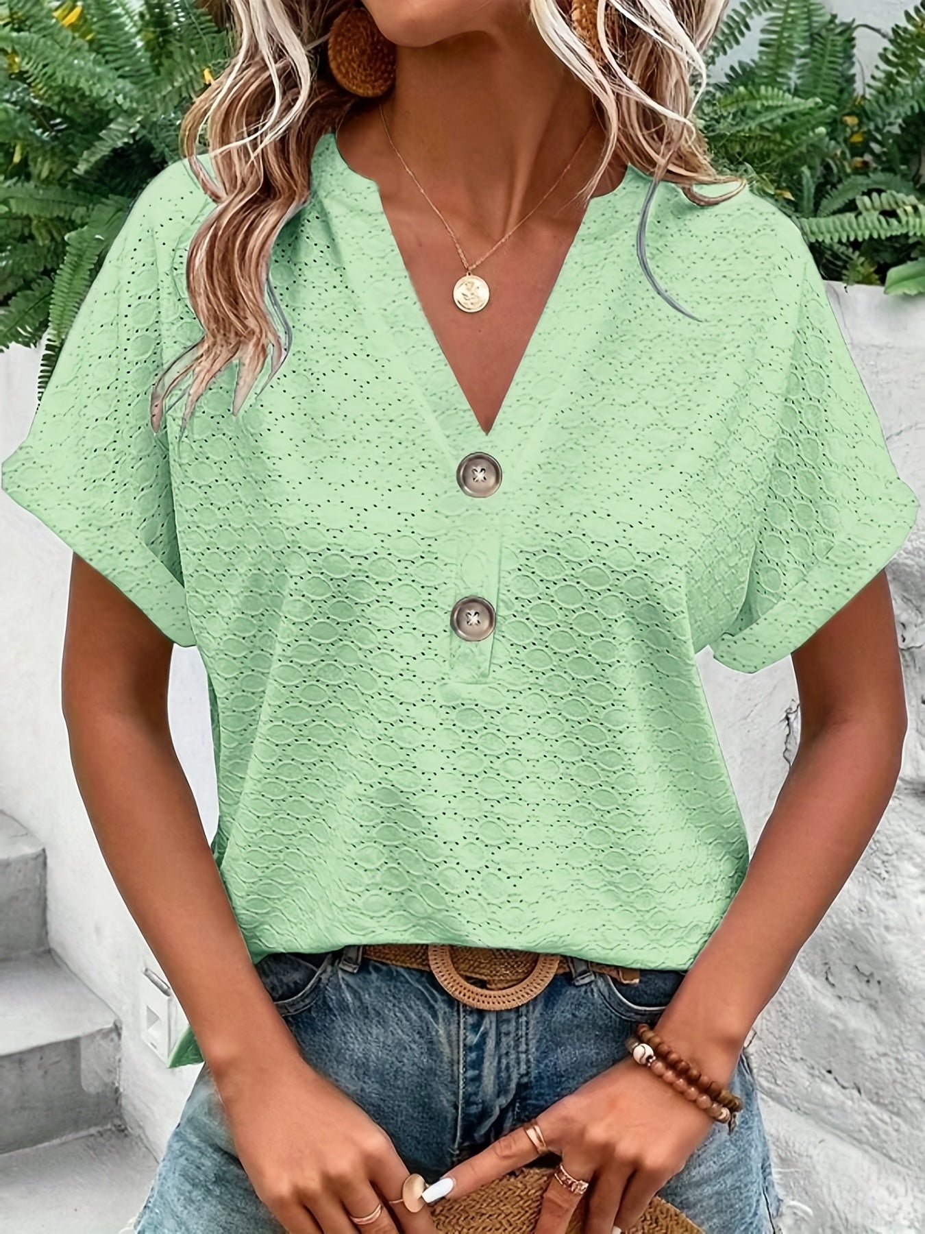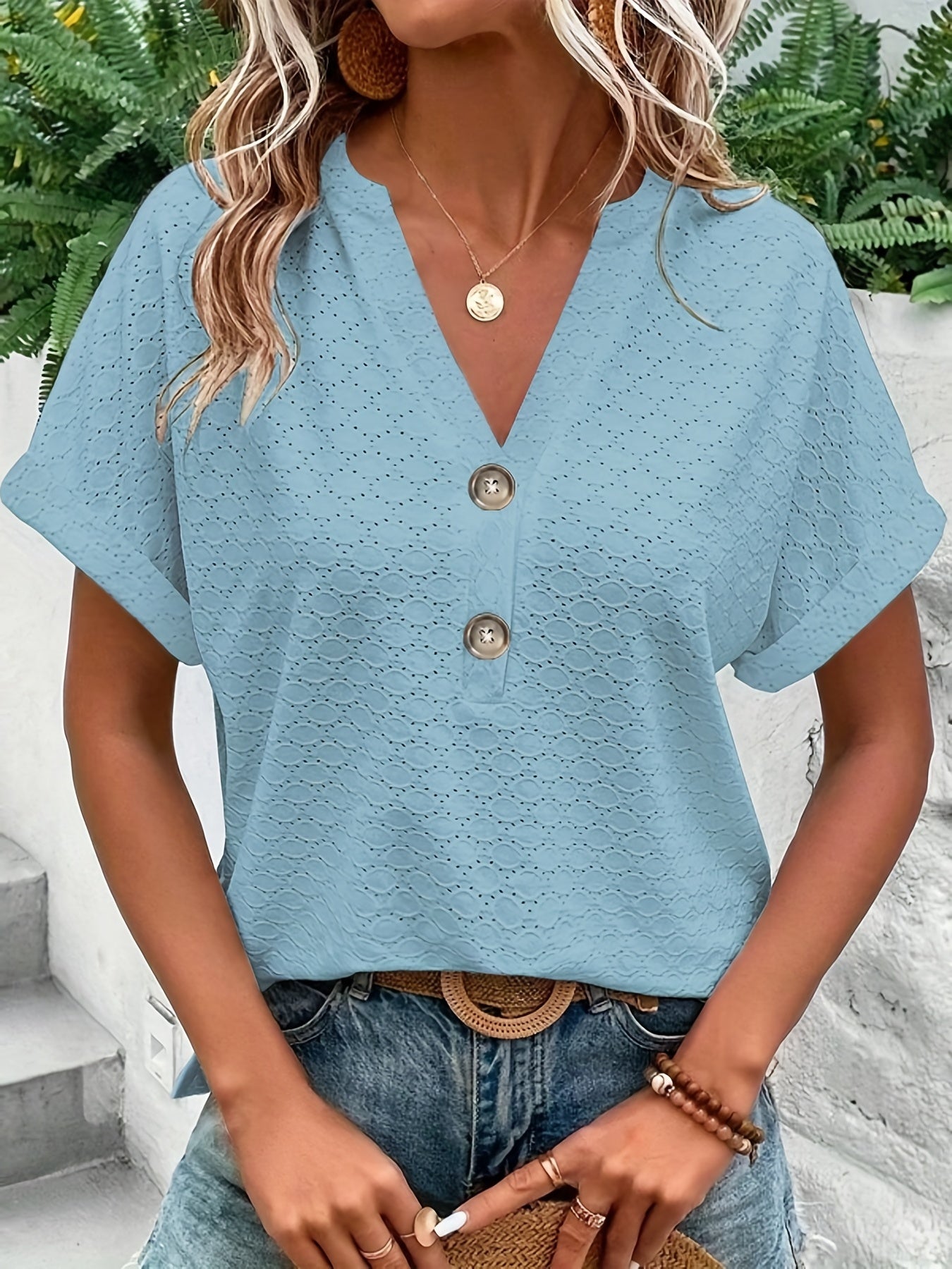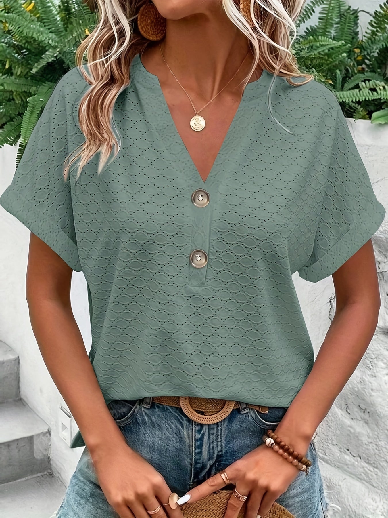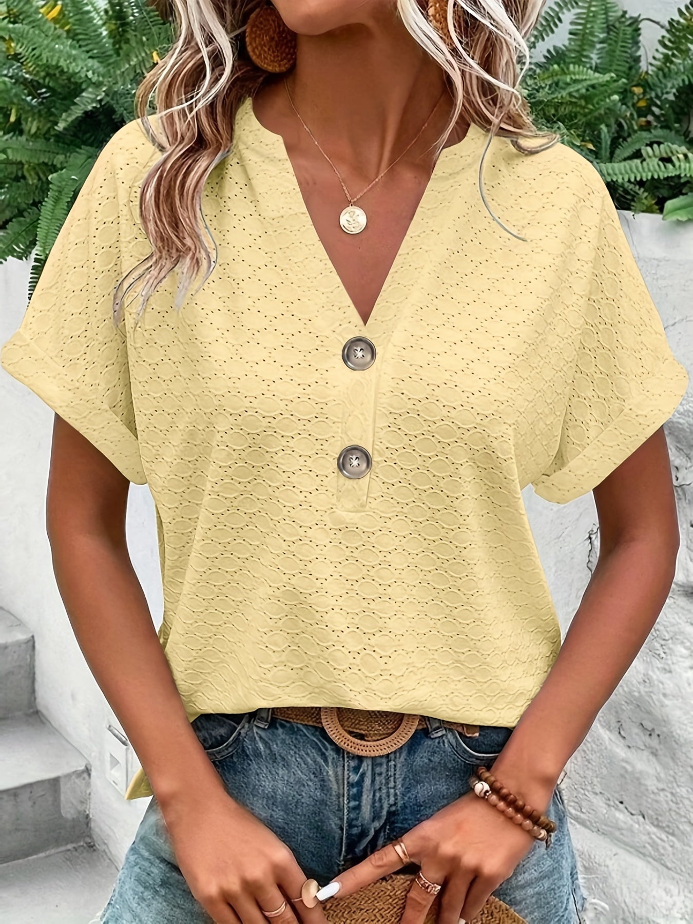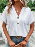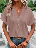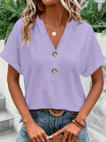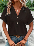 Solid Button Front V Neck T-Shirt, Casual Short Sleeve Top