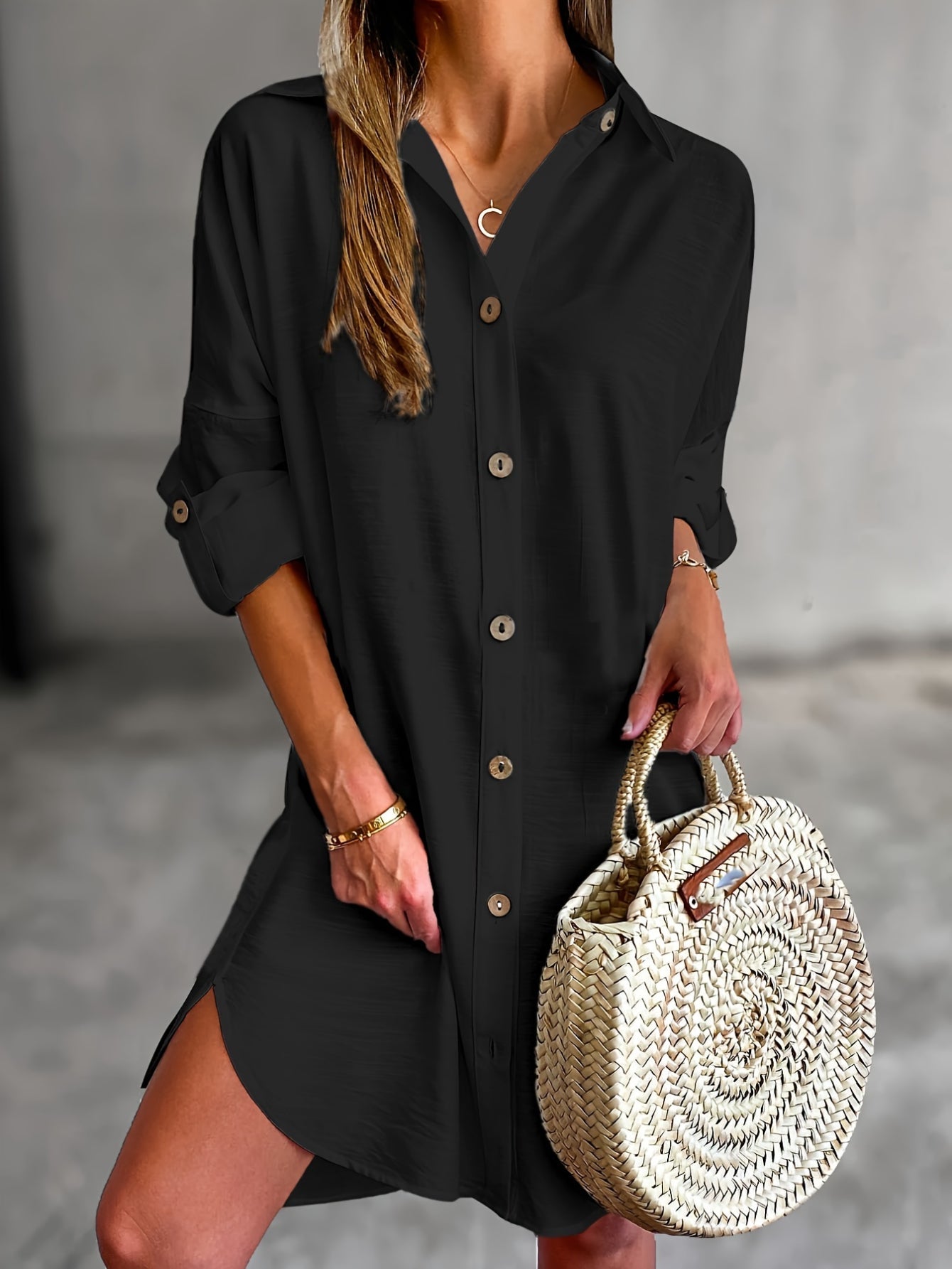 Solid Color Button Front Shirt Dress, Casual Long Sleeve Lapel Dress