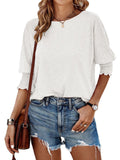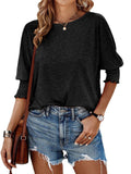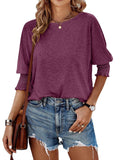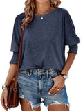Sale Solid Color Crew Neck T-shirt, Elegant Shirred 3/4 Sleeve Top