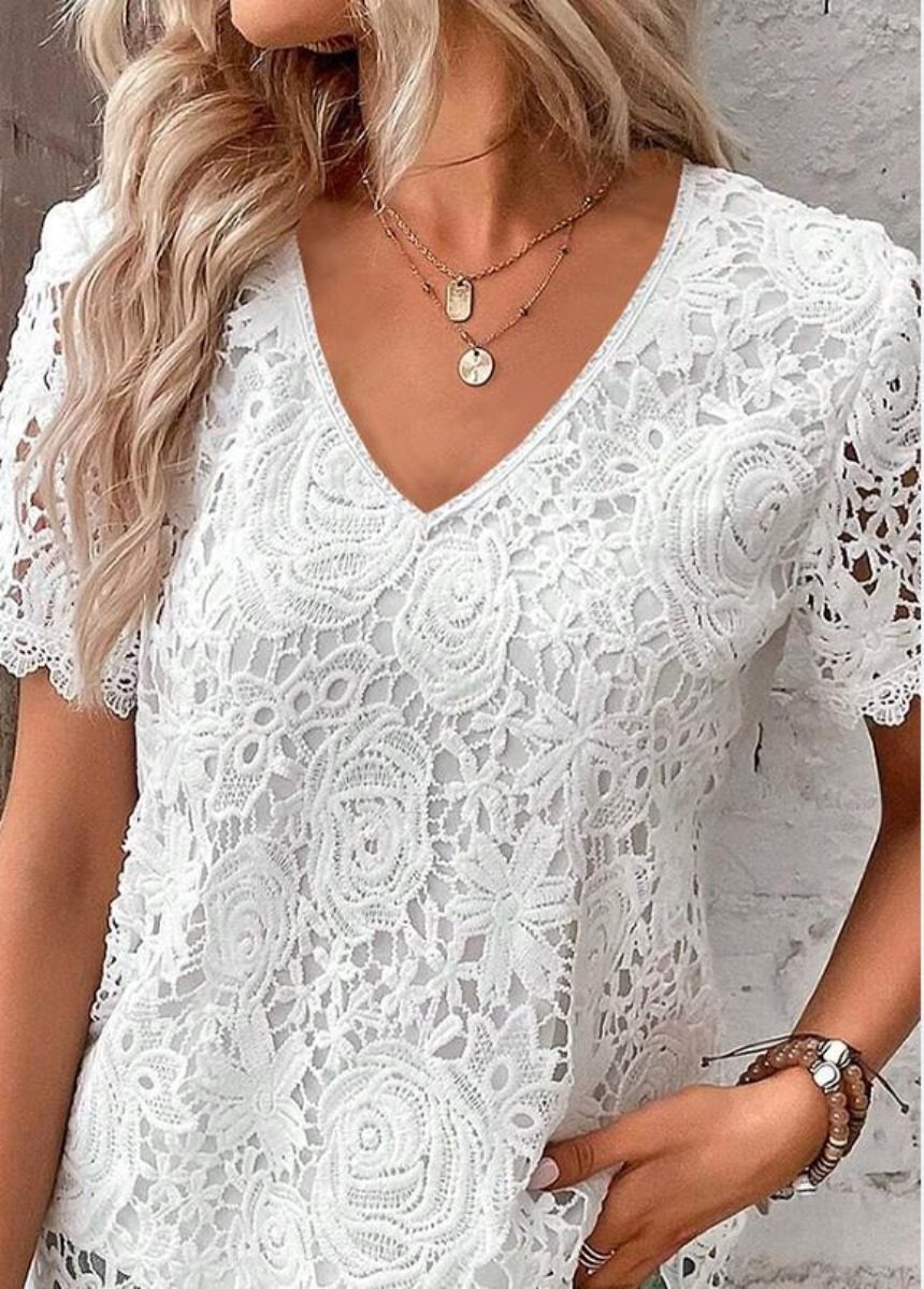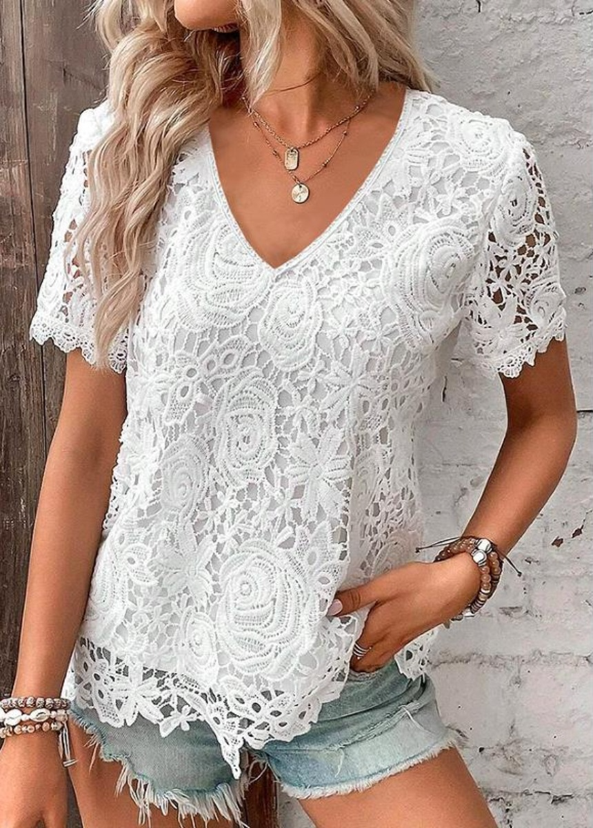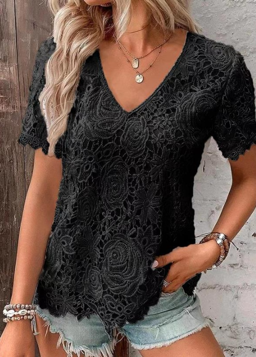 Sale Solid Color Lace Jacquard Short Sleeve T-Shirt