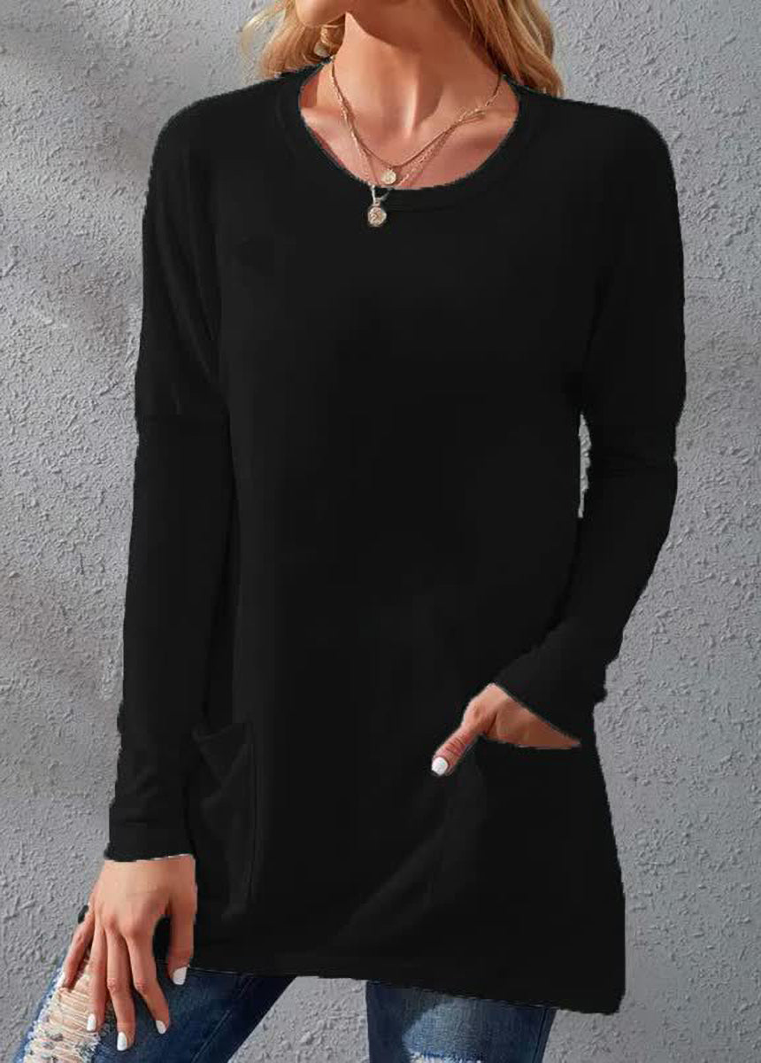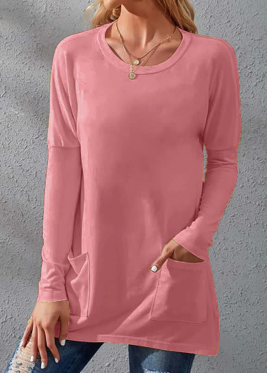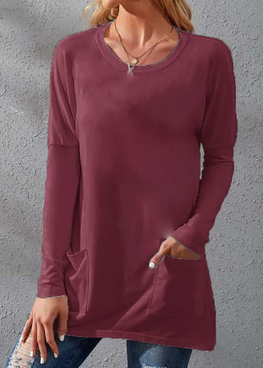 Solid Color Long Sleeve Loose Fit Round Neck Pocket T-shirt