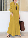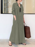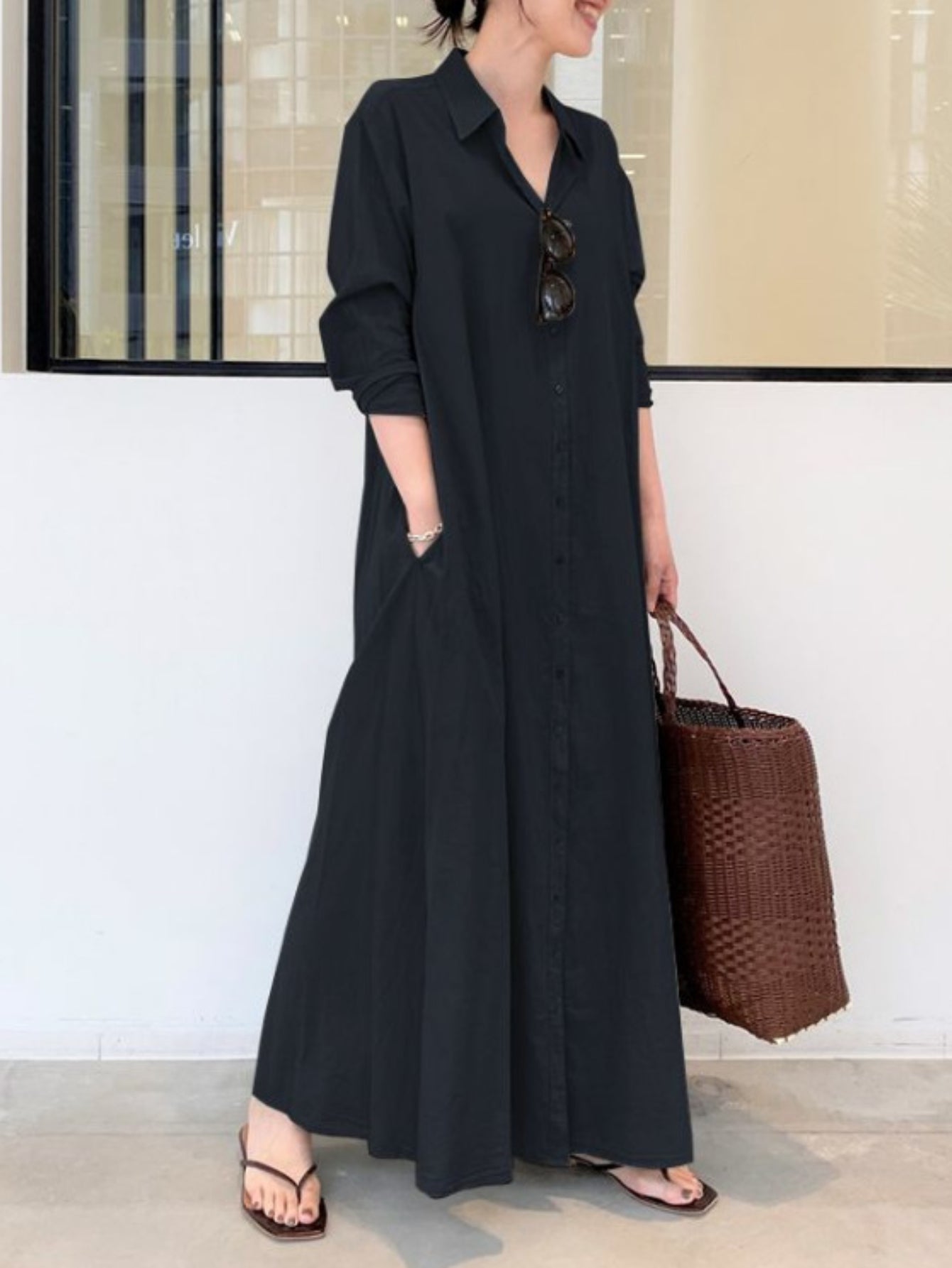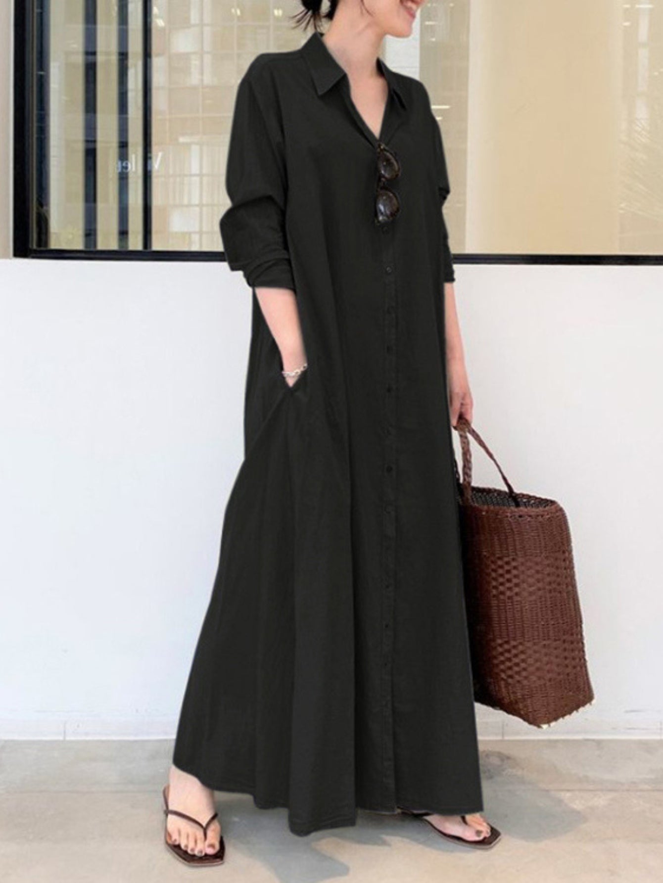 Solid Color Single Breasted Simple Dress, Elegant Long Sleeve Maxi Loose Dress