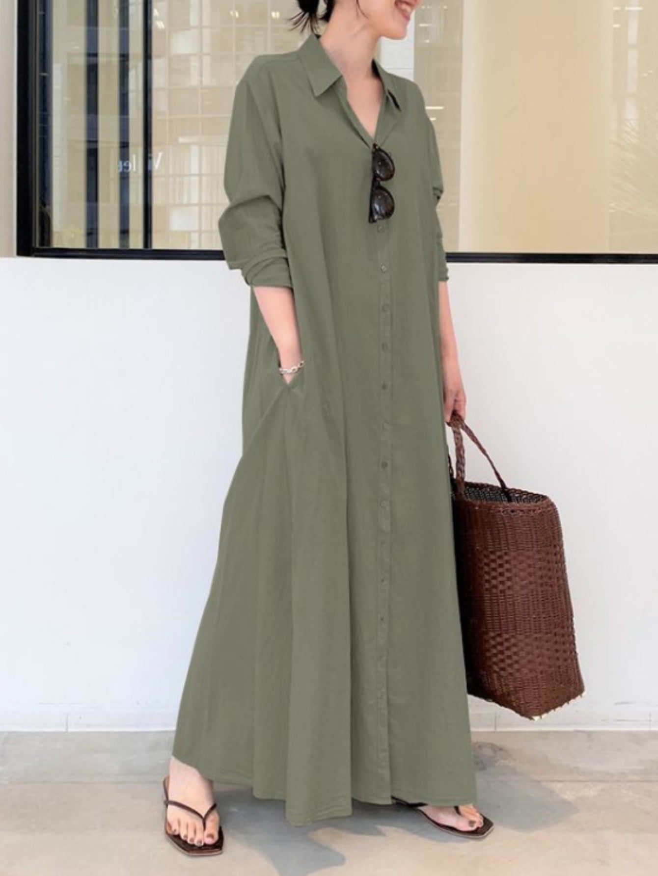 Sale Solid Color Single Breasted Simple Dress, Elegant Long Sleeve Maxi Loose Dress
