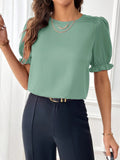Sale Solid Pleated Trim Blouse, Casual Crew Neck Short Sleeve Blouse