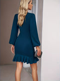 Solid Crew Neck Dress, Elegant Long Sleeve Ruffle Hem Dress