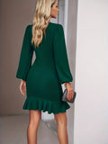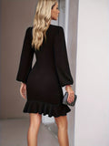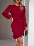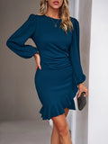 Sale Solid Crew Neck Dress, Elegant Long Sleeve Ruffle Hem Dress