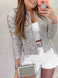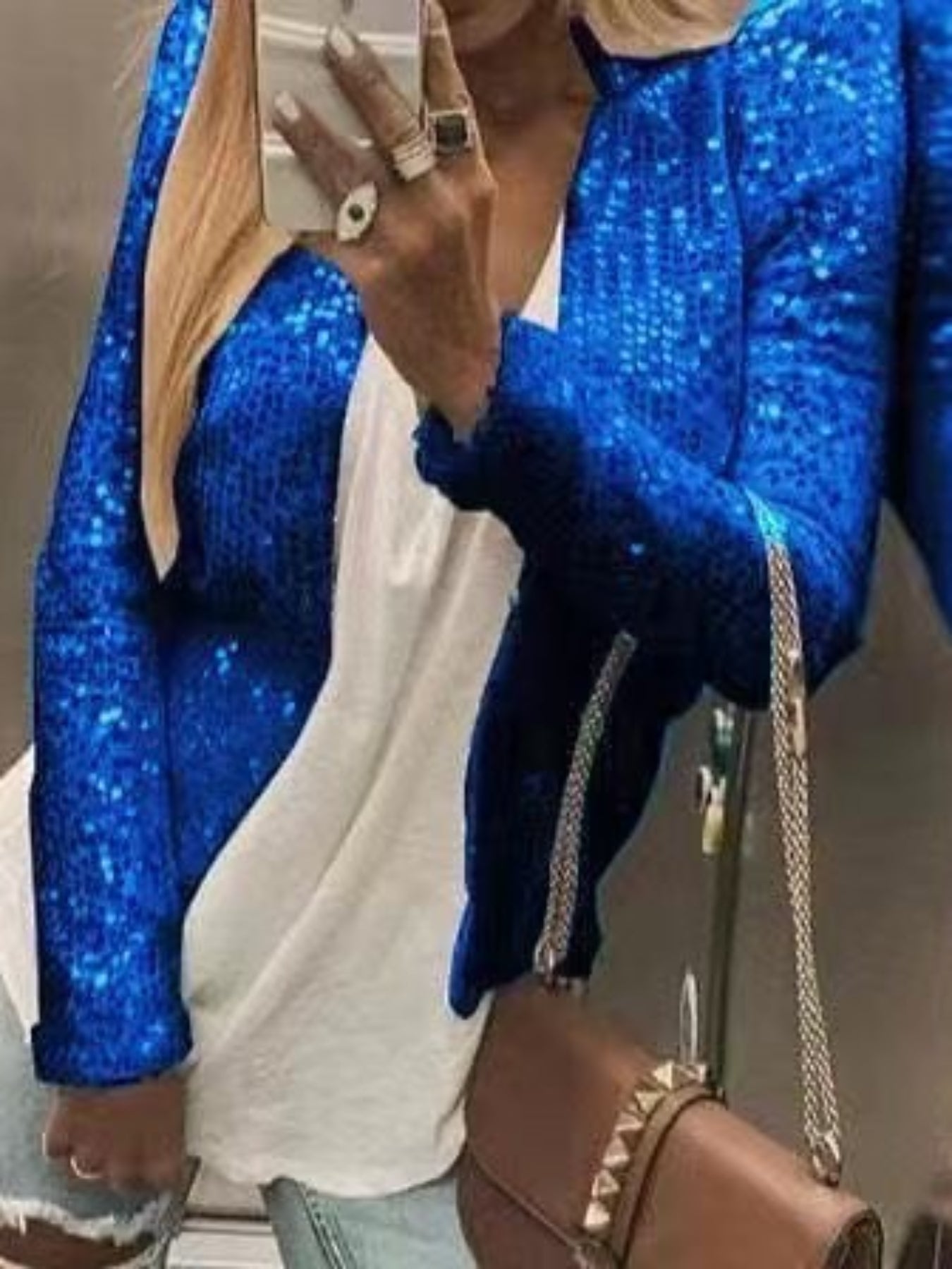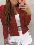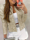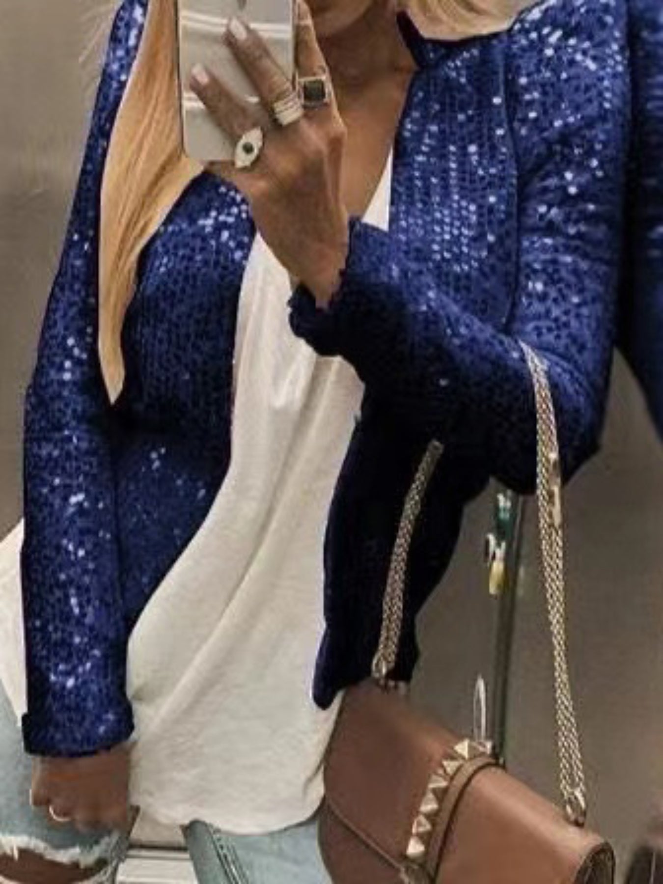 Solid Crew Neck Sequined Jacket, Long Sleeve Casual Every Day Top