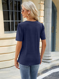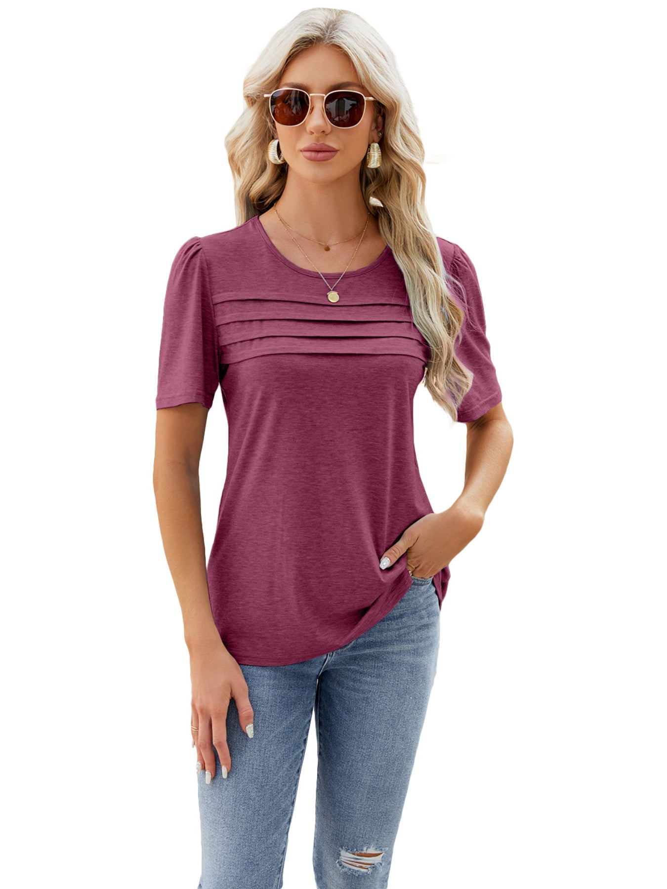 Sale Solid Pleated Trim Blouse, Casual Crew Neck Short Sleeve Blouse