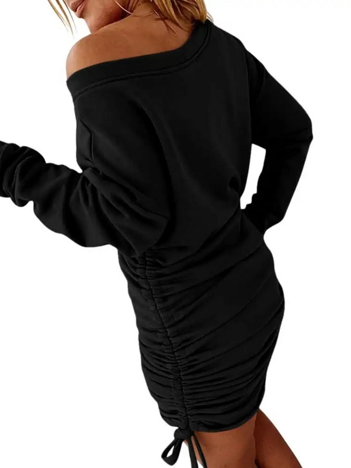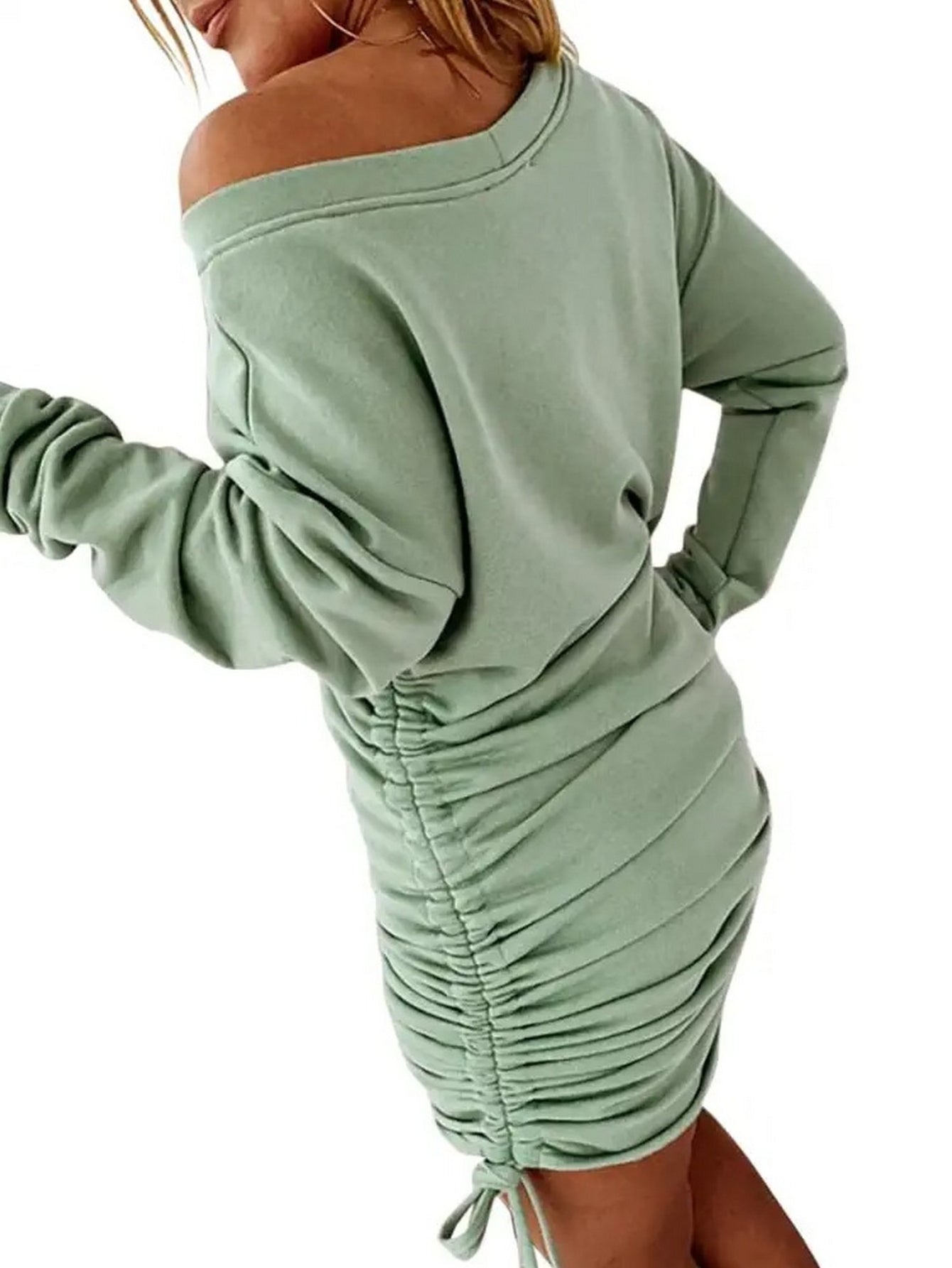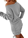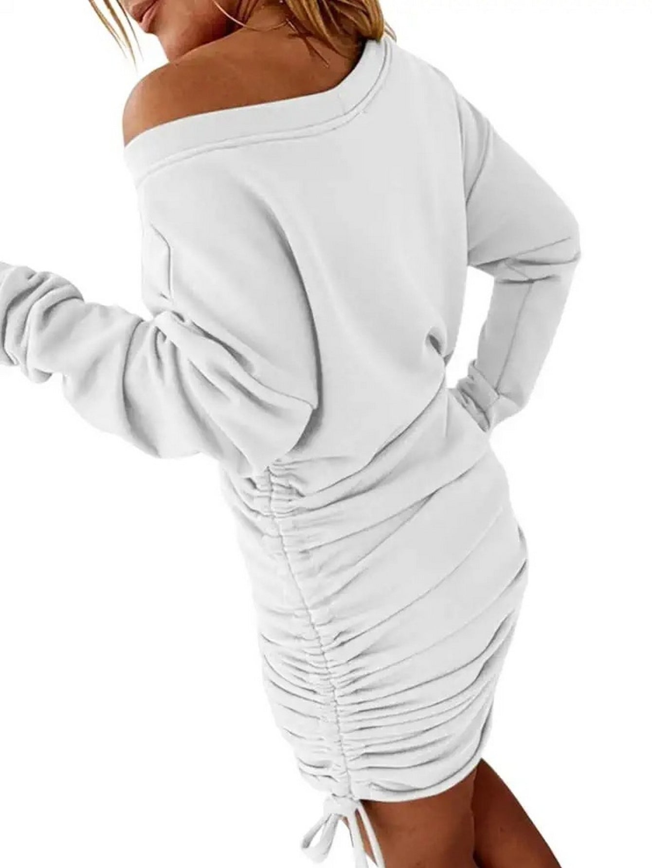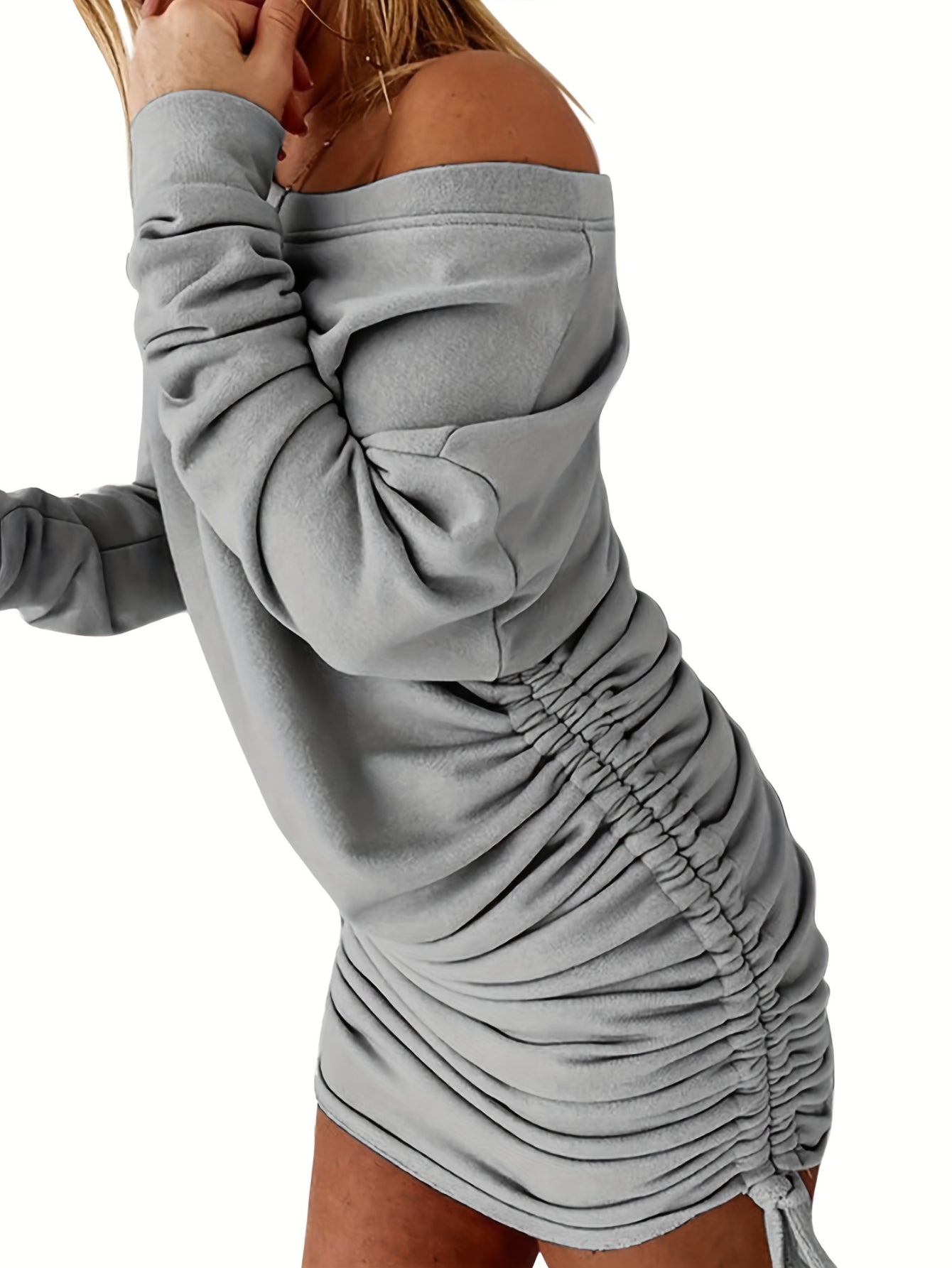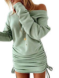 Sale Solid Drawstring Pullover Sweatshirt Dress, Casual Ruched Long Sleeve Sweatshirt Dress