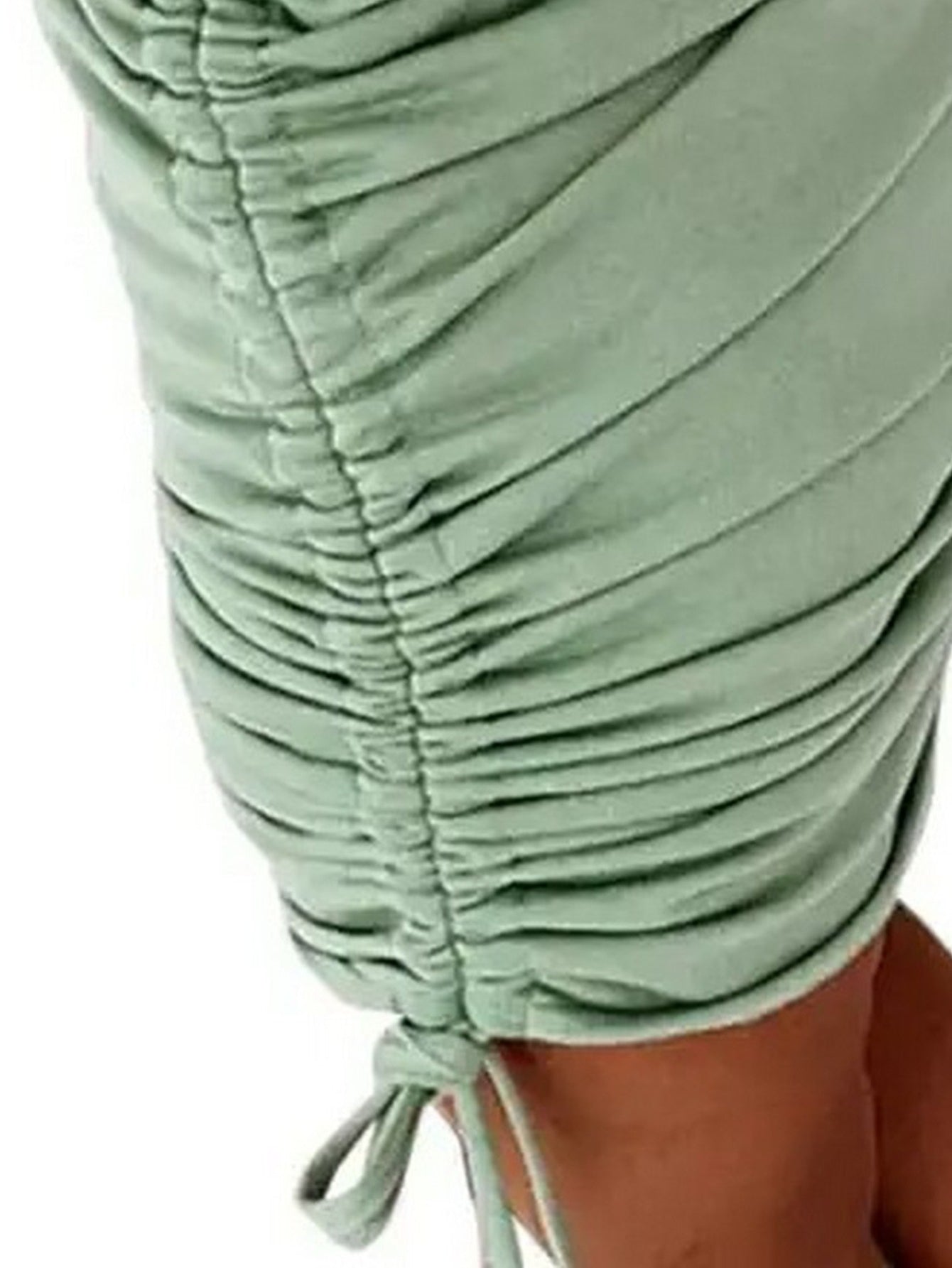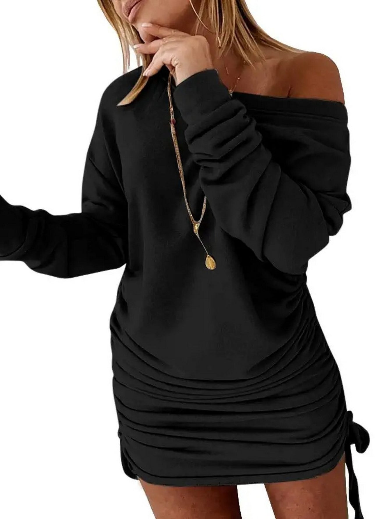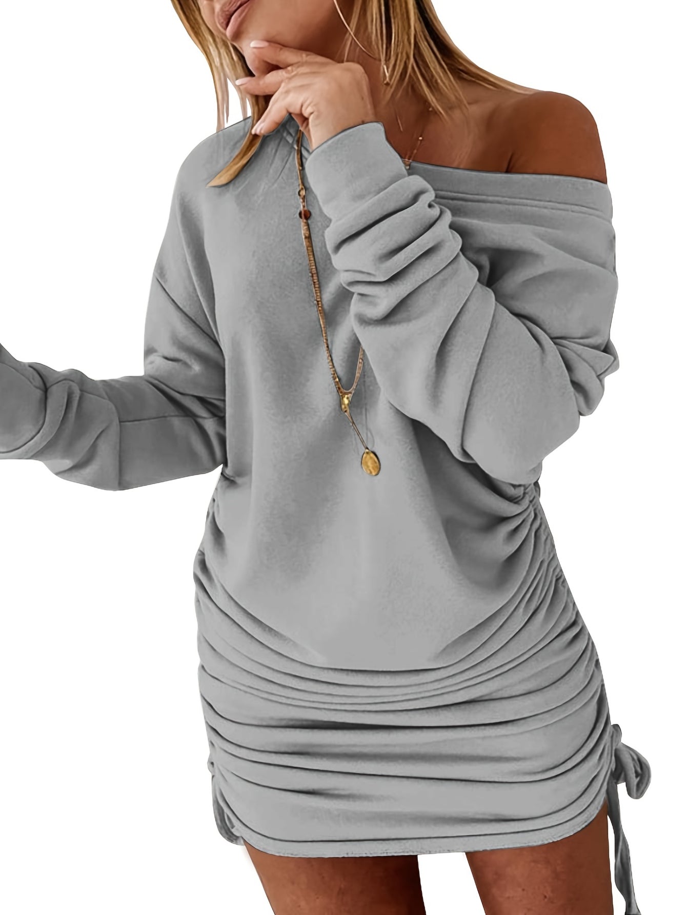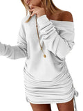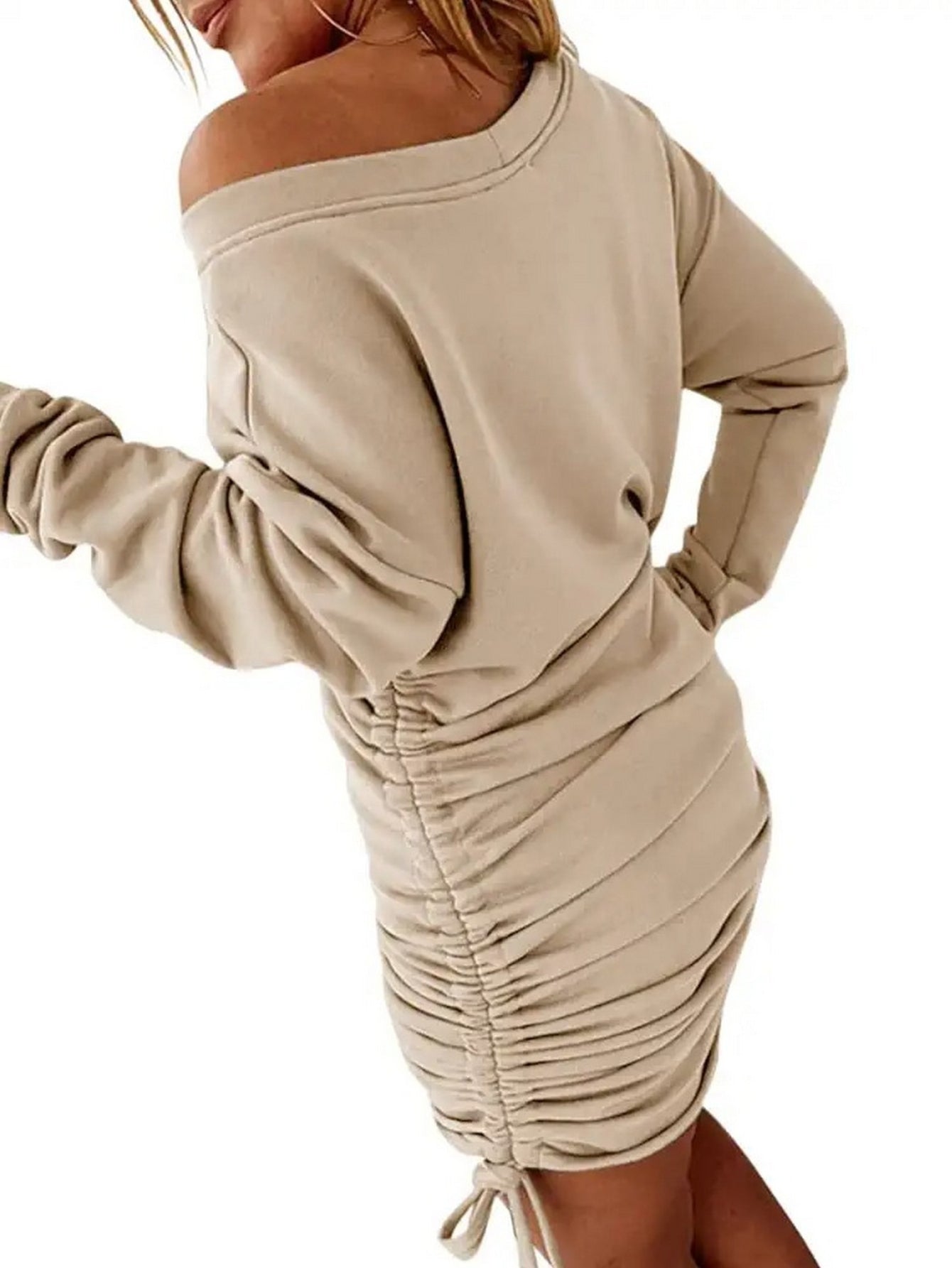 Sale Solid Drawstring Pullover Sweatshirt Dress, Casual Ruched Long Sleeve Sweatshirt Dress