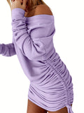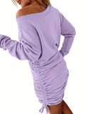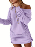Solid Drawstring Pullover Sweatshirt Dress, Casual Ruched Long Sleeve Sweatshirt Dress