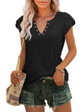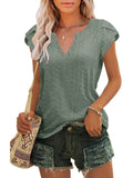 Sale Solid Eyelet Notched Neck T-shirt, Casual Petal Sleeve T-shirt