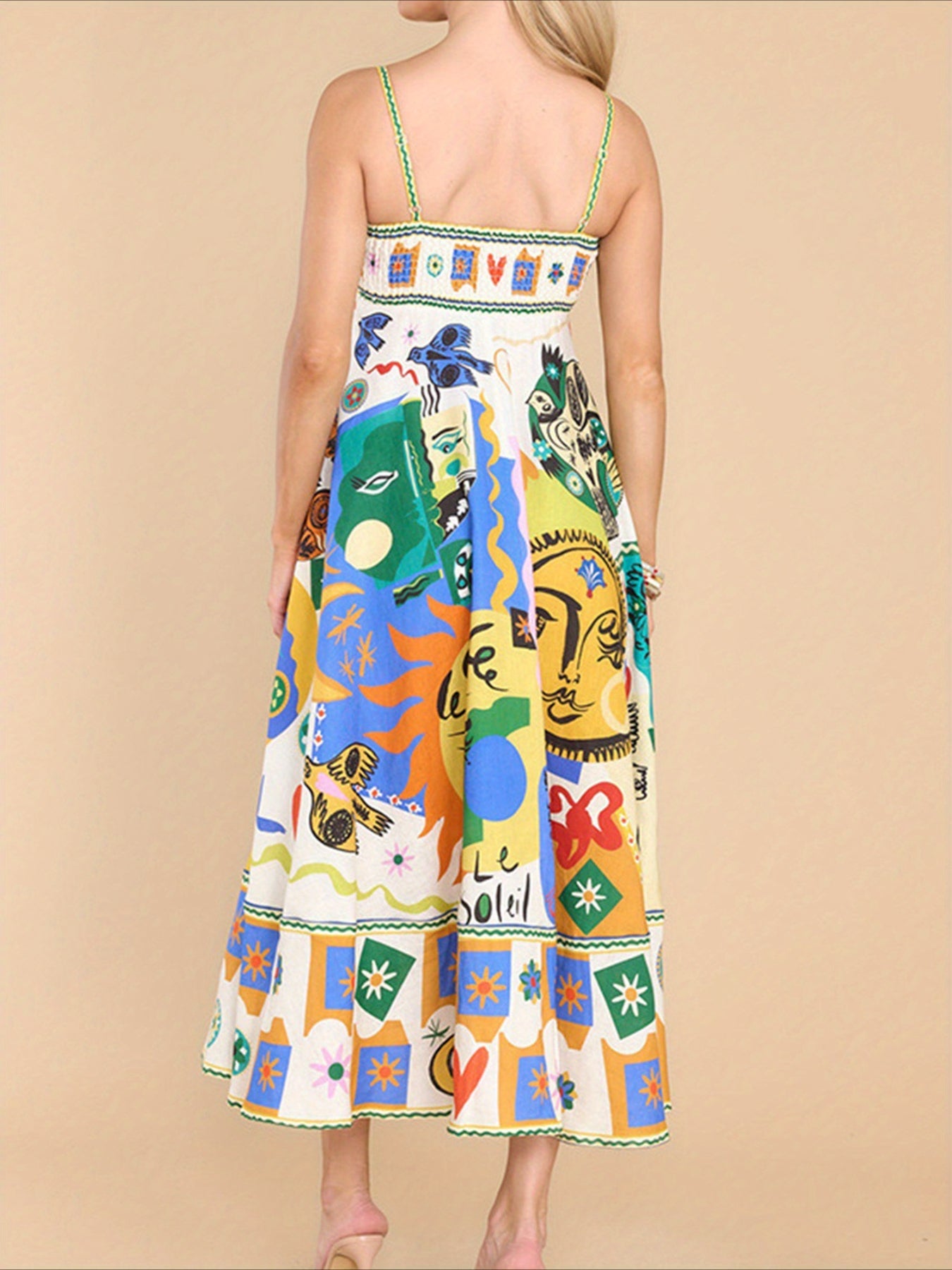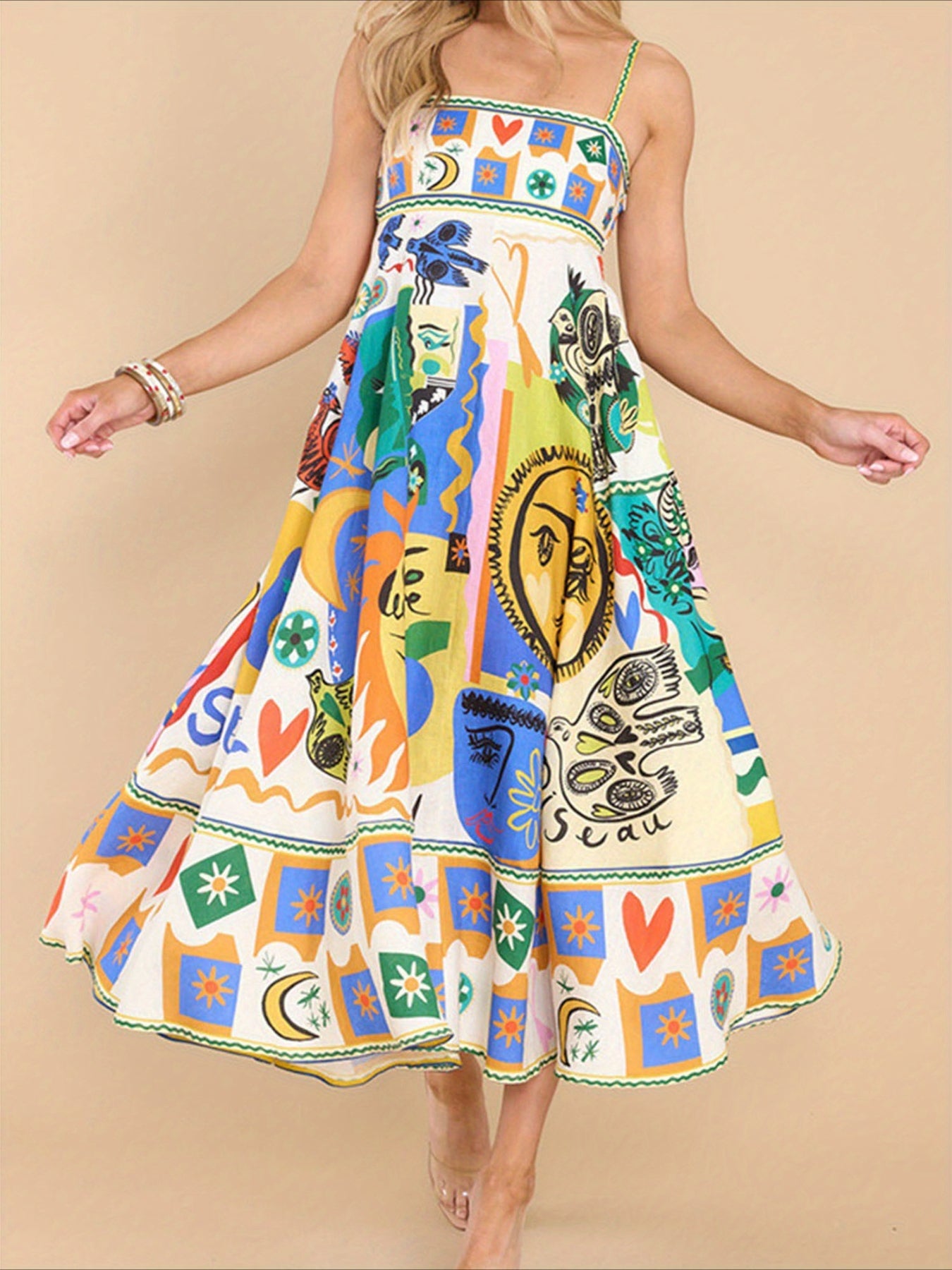Spaghetti Strap Sleeveless Print Flowy A-Line Long Dress