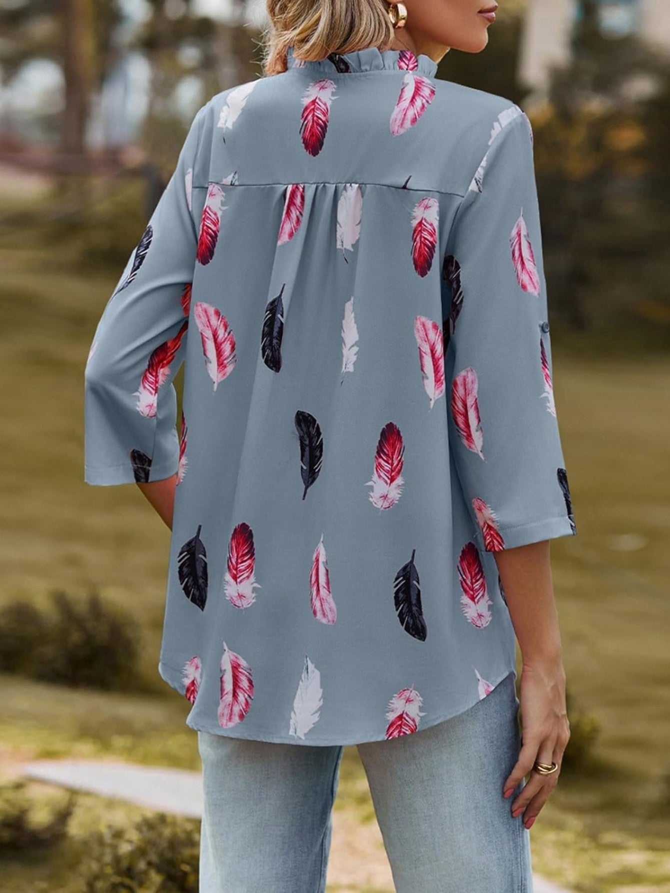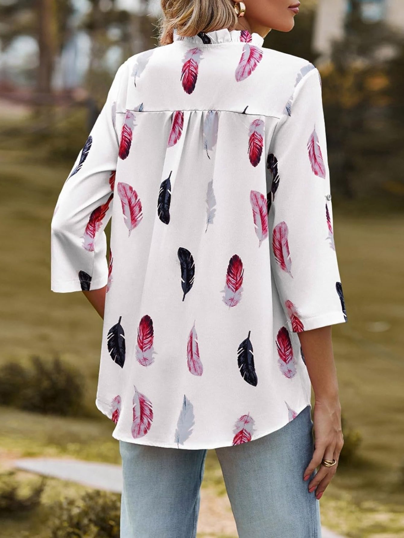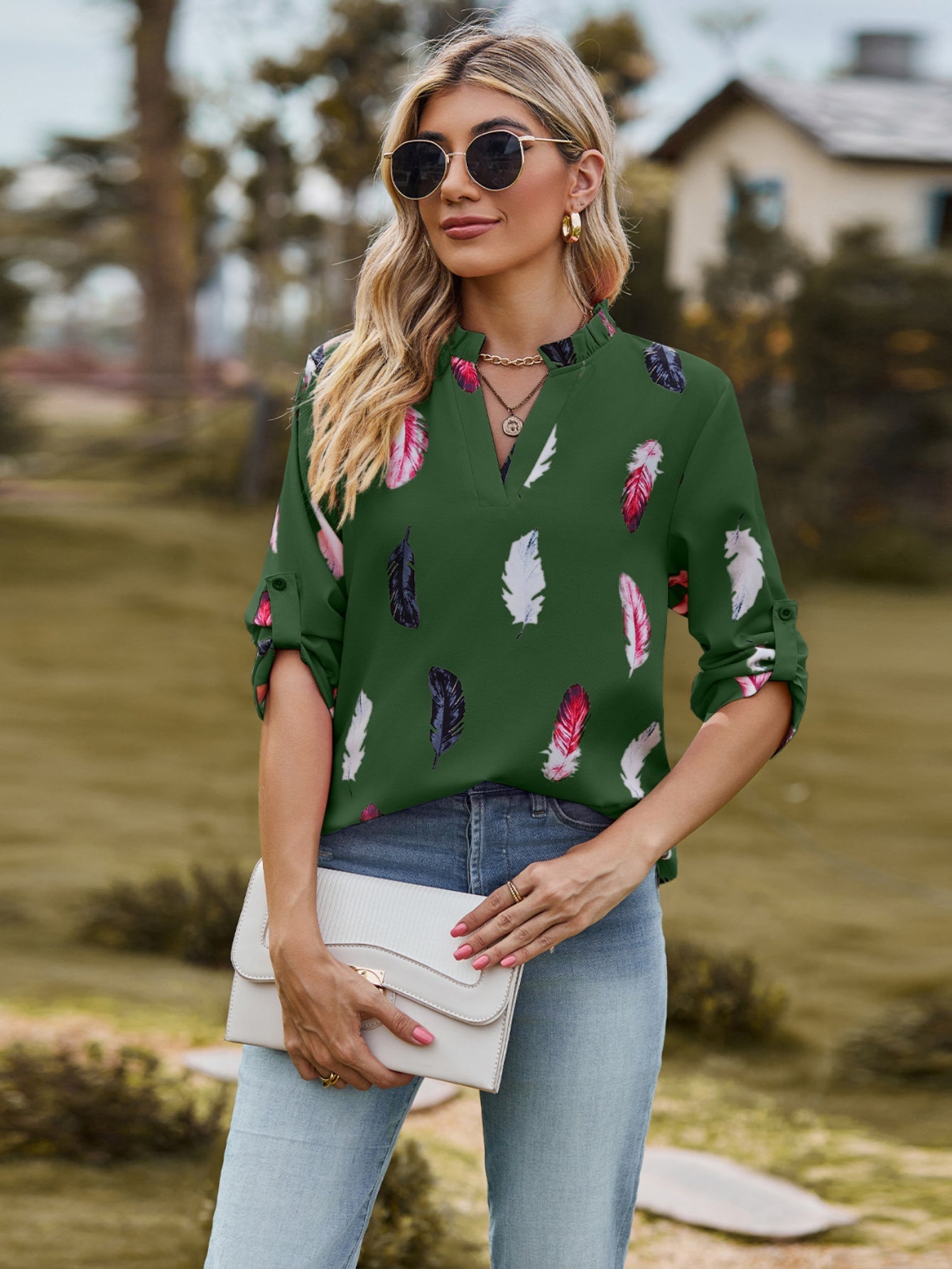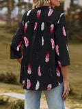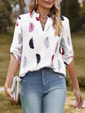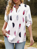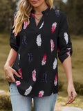 V Neck Feather Print Three Quarter Sleeve Loose Shirt