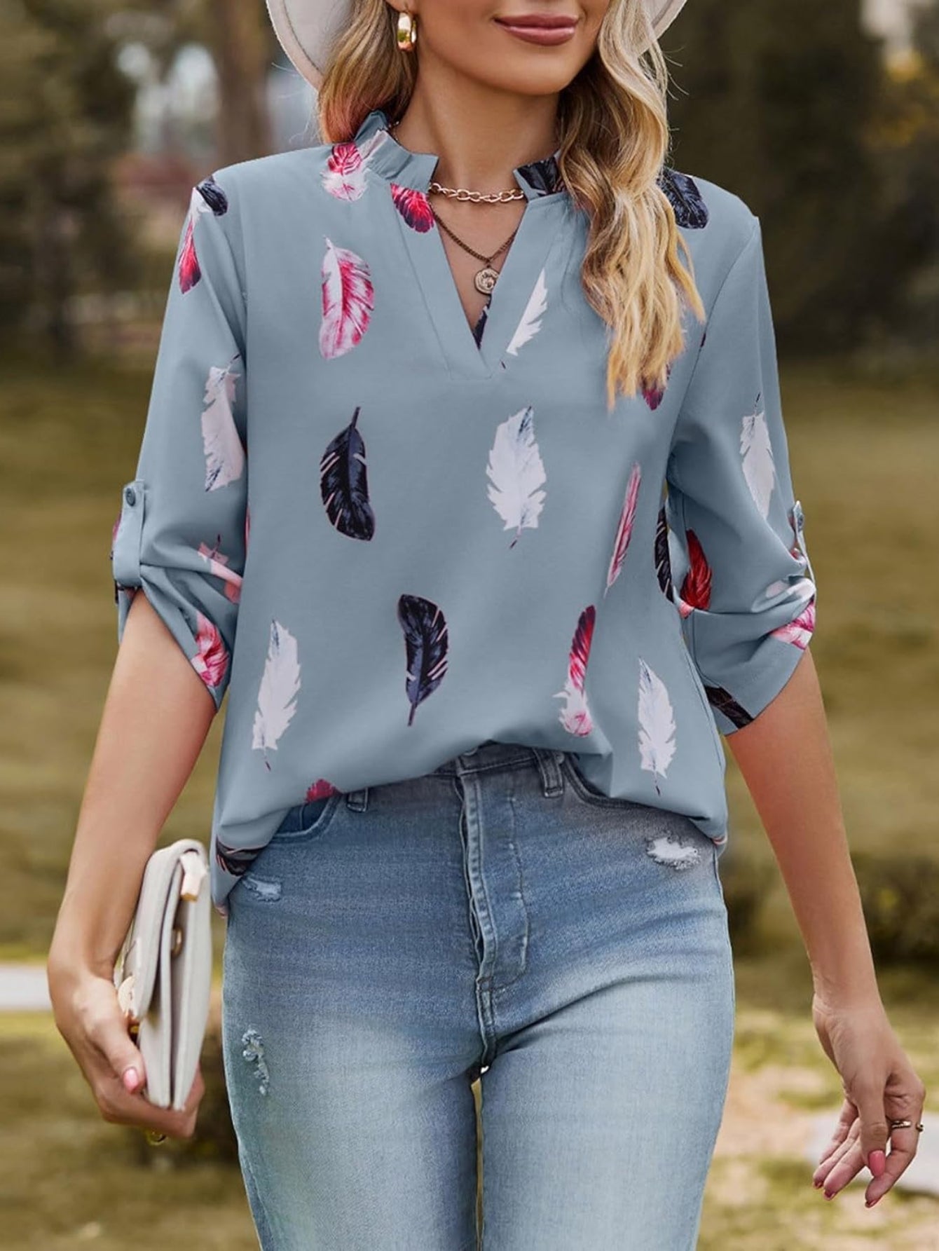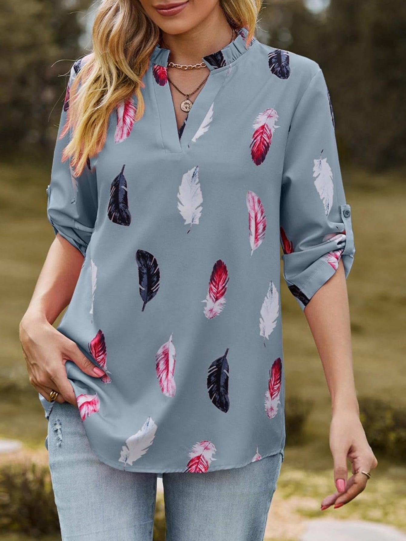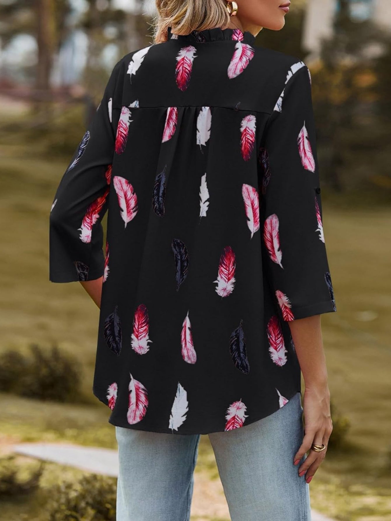 V Neck Feather Print Three Quarter Sleeve Loose Shirt