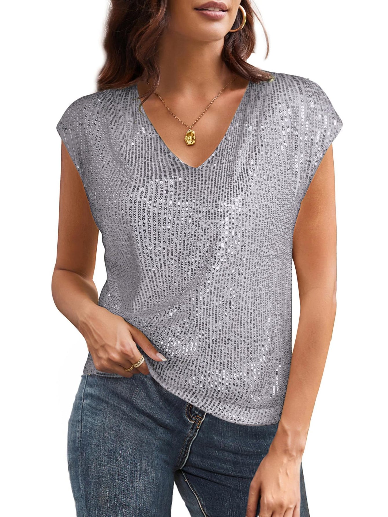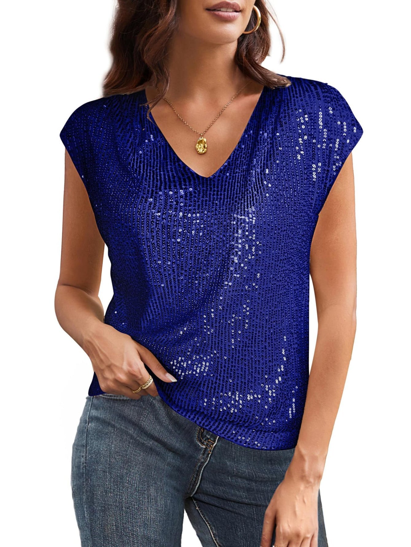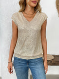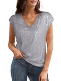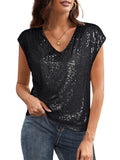 Sale V Neck Sequined Solid Color Short Sleeved Top
