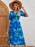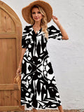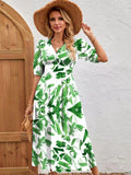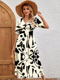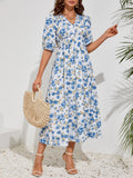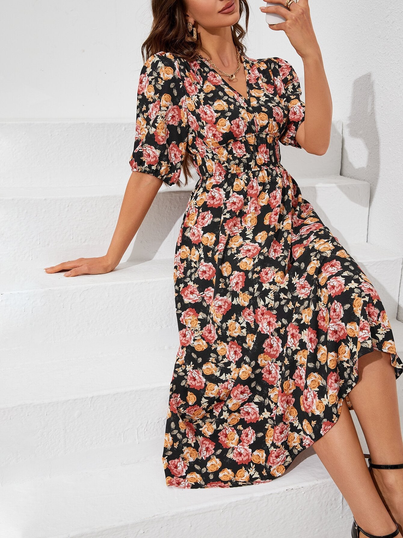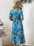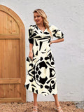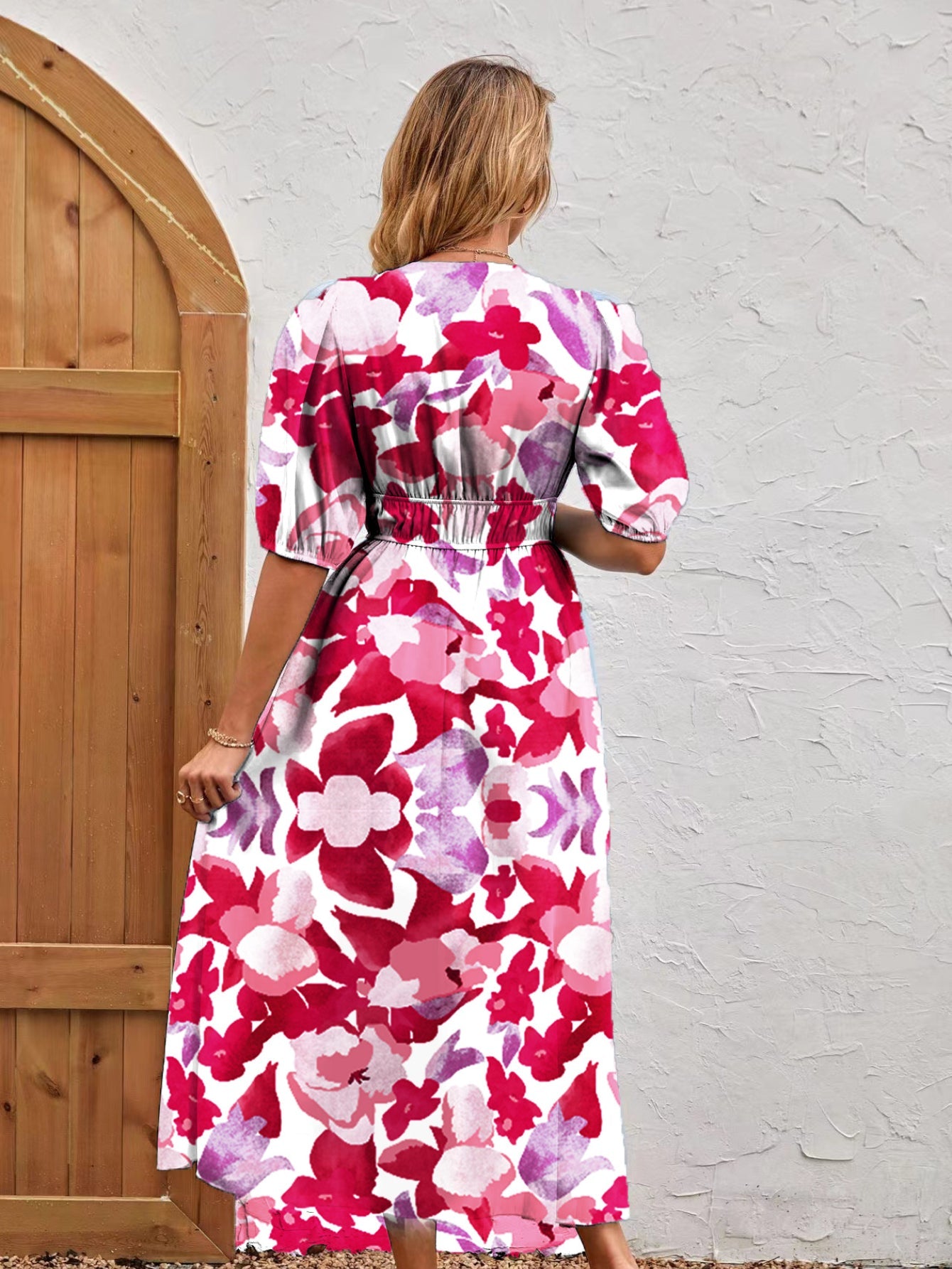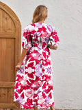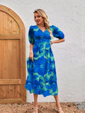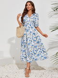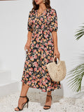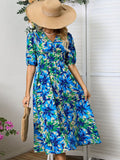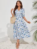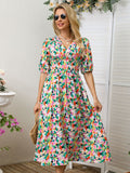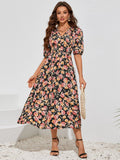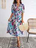 V Neck Short Sleeve Cinched Waist Floral Midi Dress