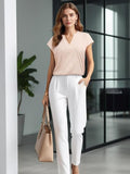 Sale Solid Pleated Trim Blouse, Casual Crew Neck Short Sleeve Blouse