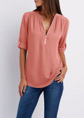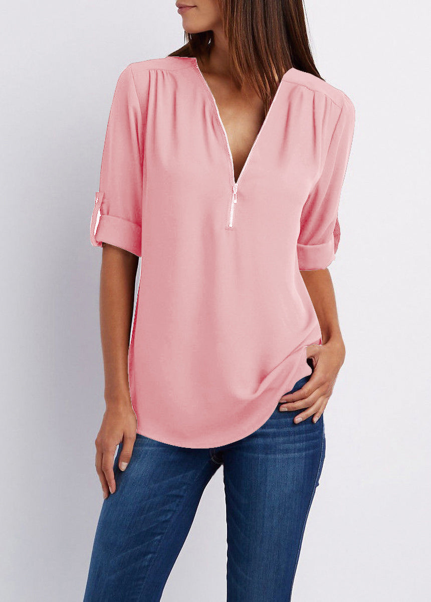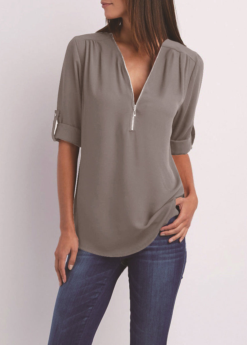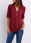 V-neck Zipper Loose Fit Chiffon Long Sleeve Shirt